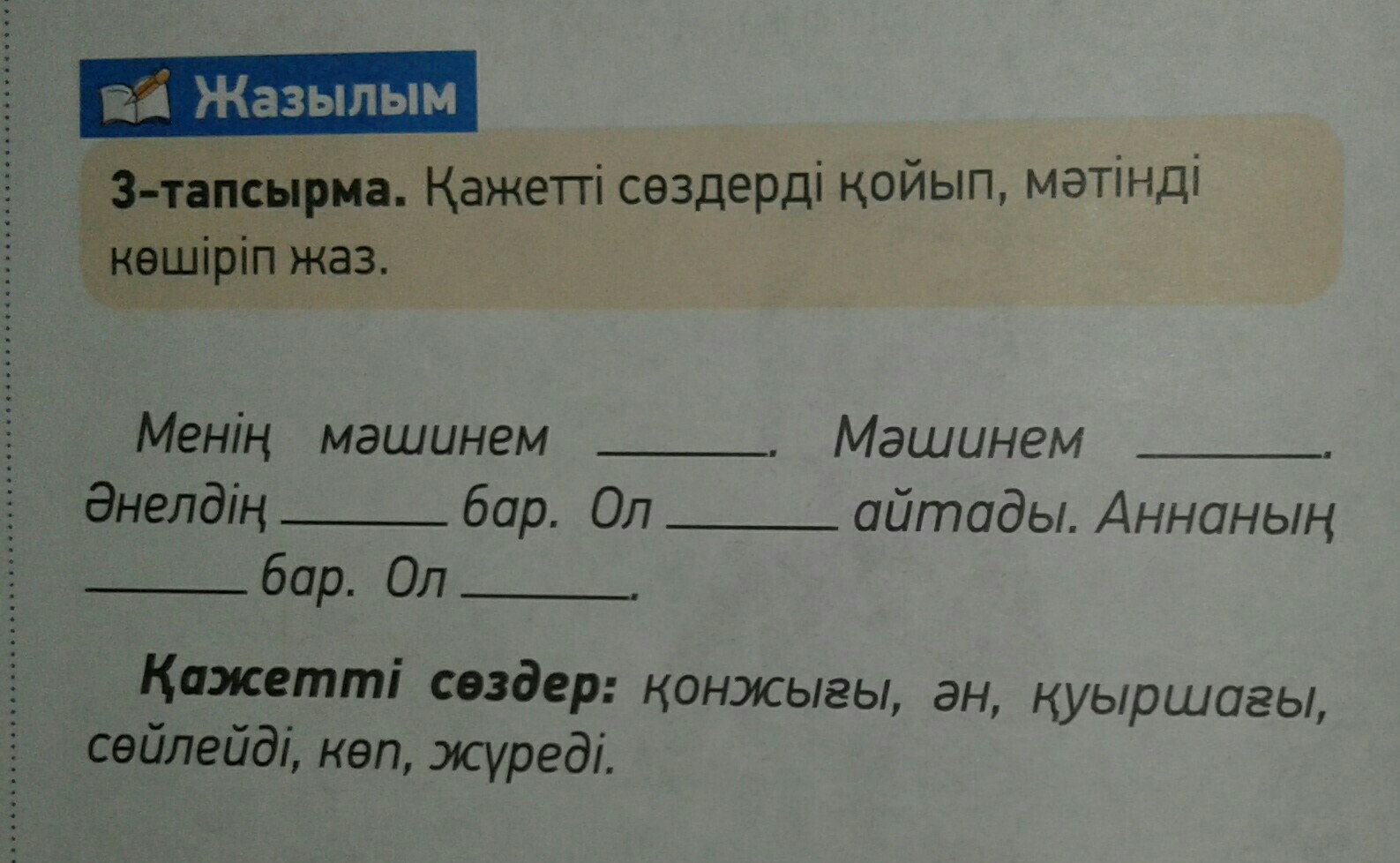 Менің мәшинем көп. Мәшинем жүреді.Әнелдің қуыршағы бар. ол ән айтады. Аннанын қонжығы бар. Ол сөйлейді
