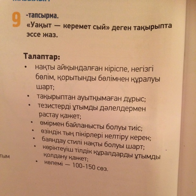 Уакыт керемет сый уакытты унемдеу керек. Оны пайда мен откизу керек. Адамга бир нарсе истесен бир куны ол саган кайтып келеды. Ал Адамды сыйласан Мысалы карт аталарды аталарды бир кухни сол жаксылык саган айналып келеды. Жалкаулыкпен откизсен уакытты Мысалы : компьютер ойнасан коп китап окымасан омирин солай отип кетеди. Сосын кир жумыстарда истеп журесин. Сол ушин казырдан ойланып сабакты жаксы окып грантыка поступать ету керек.