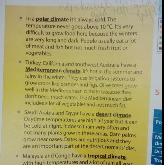 ° В полярном климате всегда холодно. Температура не превышает 10 ° C. Здесь очень сложно выращивать пищу, потому что зимы очень длинные и темные. Люди обычно едят много мяса и рыбы, но не много свежих фруктов или овощей. Средиземноморский климат в Турции, Калифорнии и на юго-западе Австралии. Зимой жарко, дождливое зимой. Они используют ирригационные системы для выращивания сельскохозяйственных культур, таких как апельсины и инжир. Оливковые деревья хорошо растут в средиземноморском климате, потому что им не нужно много воды. Средиземноморская диета включает много овощей и не много жира. , Саудовская Аравия и Египет имеют климат пустыни. Дневные температуры высоки в течение всего года, но ночью может быть холодно. В этих районах не очень часто не так много растений. Палицы пальцев растут около оазисов. Даты питательны, и они являются важной частью диеты пустынных кочевников. ,