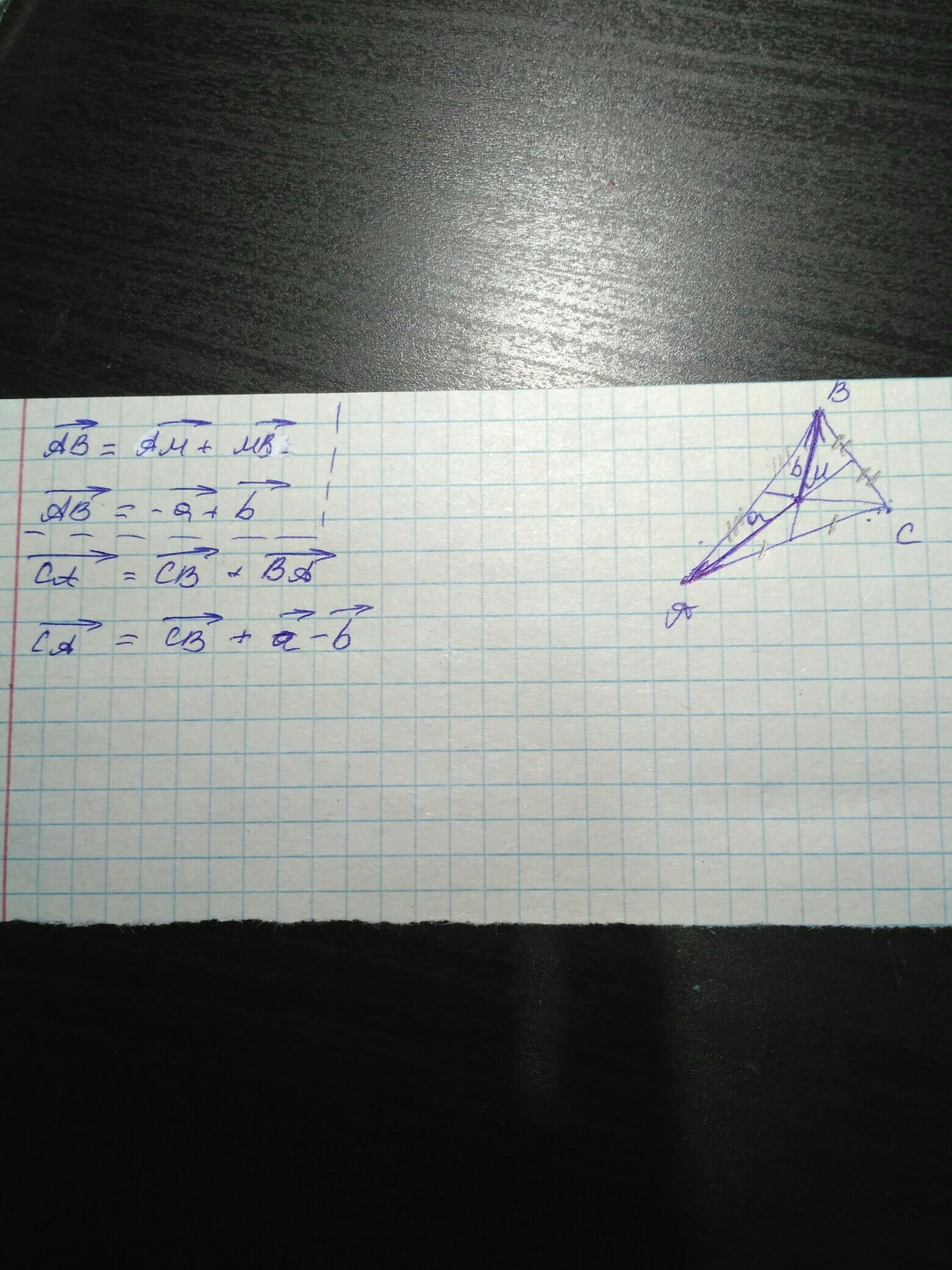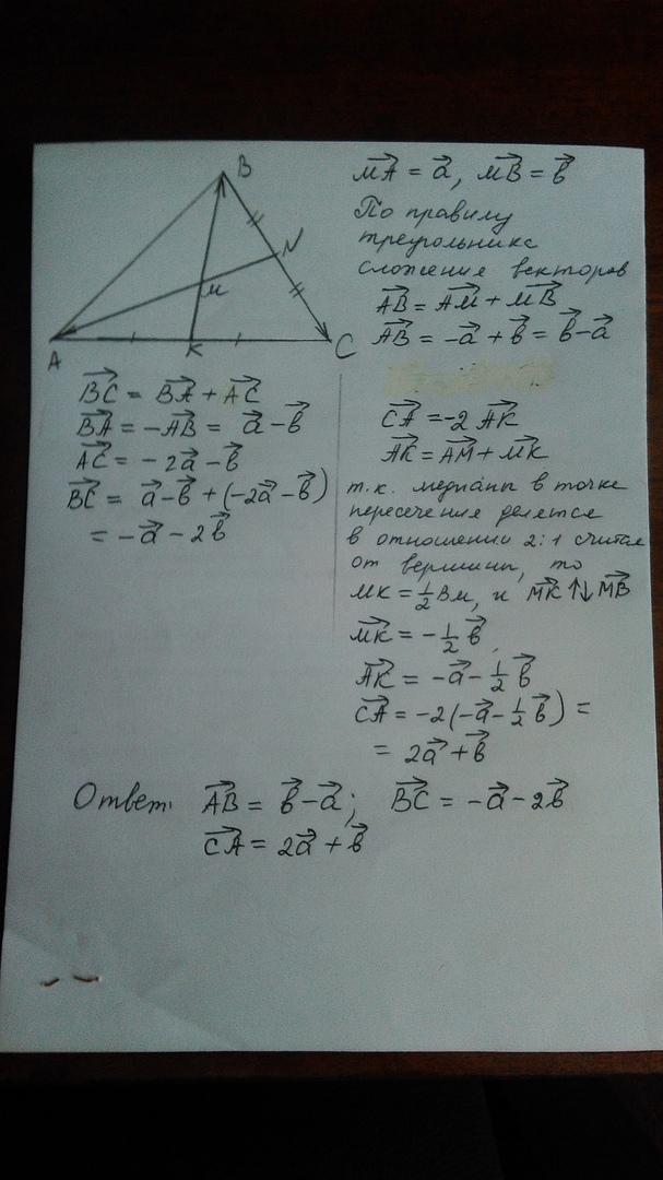 в треугольнике АВС М точка пересечения медиан, МА = а, МВ = . Выразите векторы АВ, вс, СА через векторы а и b .