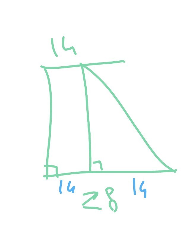 проведем высоту из вершины тупого угла к основанию. она отрежет от большой стороны отрезок 14, соответственно, второй отрезок будет (28-14)=14. справа видим равнобедренный треугольник (углы 90 и 45, значит третий угол тоже 45), с известной боковой стороной — 14. значит, длина высоты тоже равна 14.