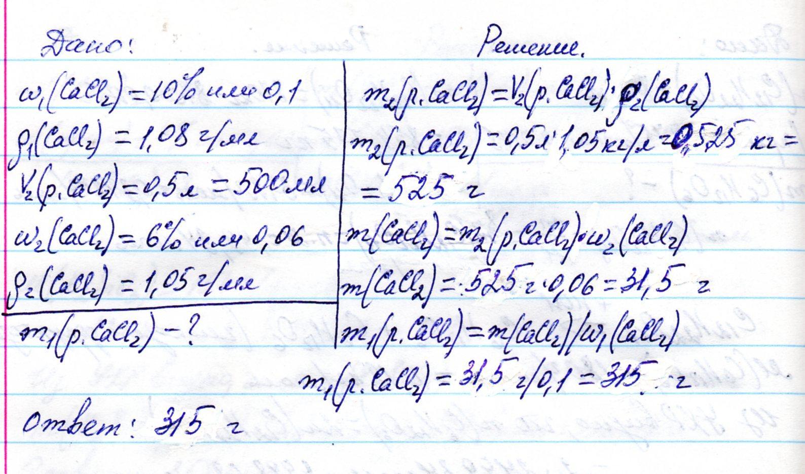Хелп ми плиз . 70 БАЛЛОВ. Определите массу 10% раствора хлорида кальция плотностью 1,08 г/мл, который необходимо взять для приготовления 0,5л 6% раствора плотностью 1,05г/мл.