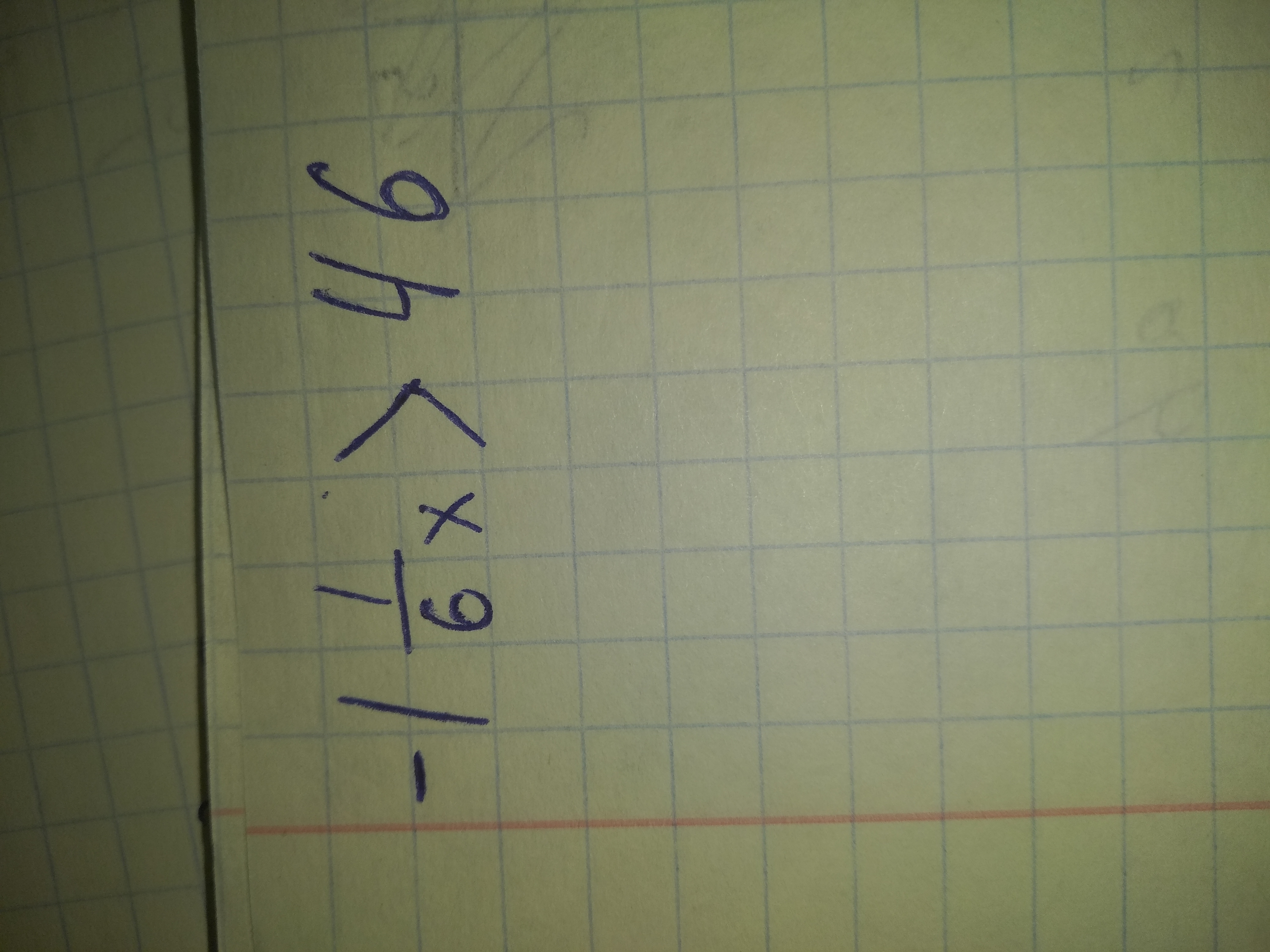 - 1 1/6 x >46 = - 7 / 6 x > 46 = 6/7 * 7/6 x < - 6/7 * 46 = 1/7 * 7x < -6/7 *46 = x< - 276/7