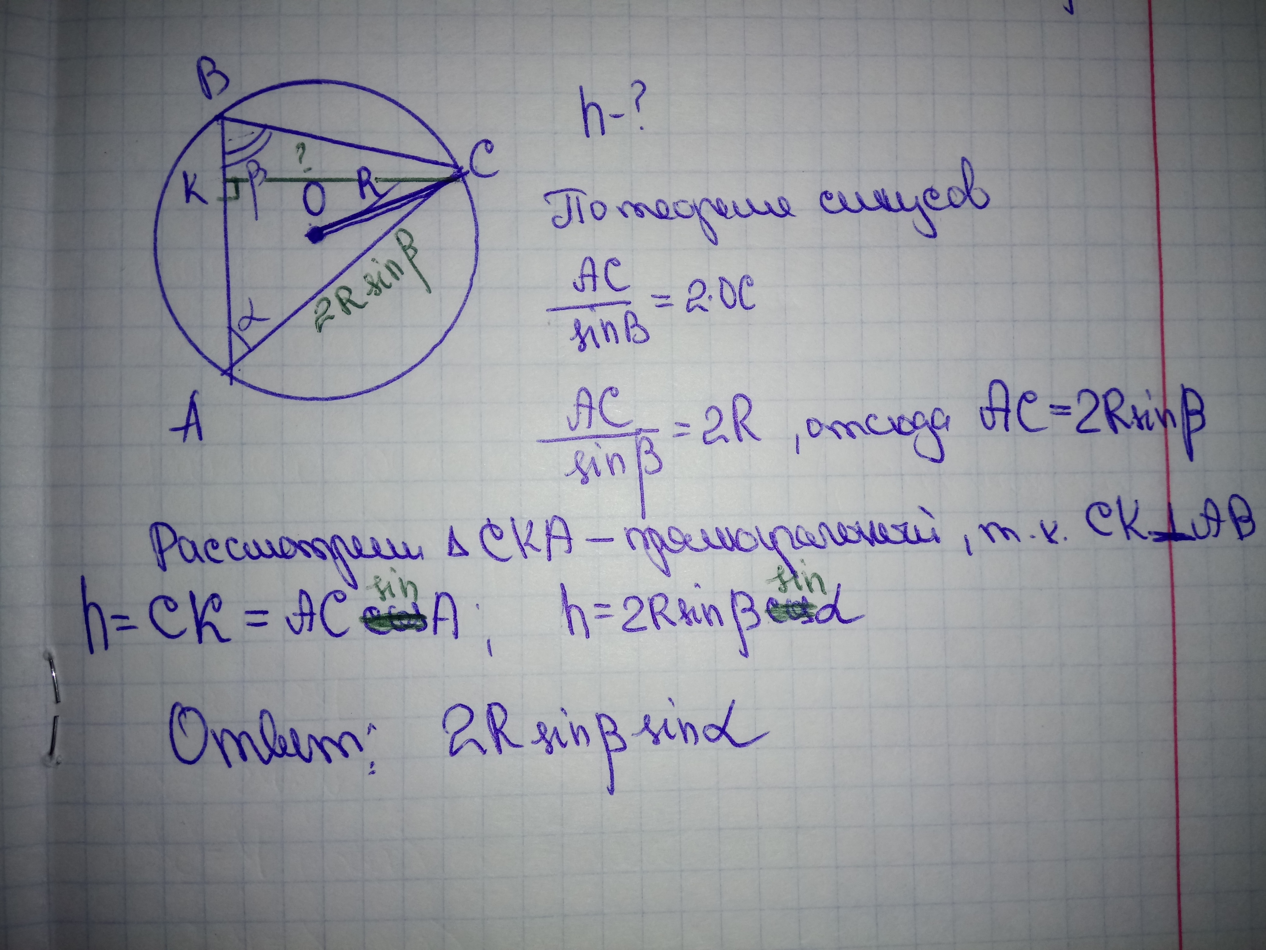 В треугольнике два угла a и b , радиус R описанной окружности. Найдите высоту , опущенную из вершины третьего угла