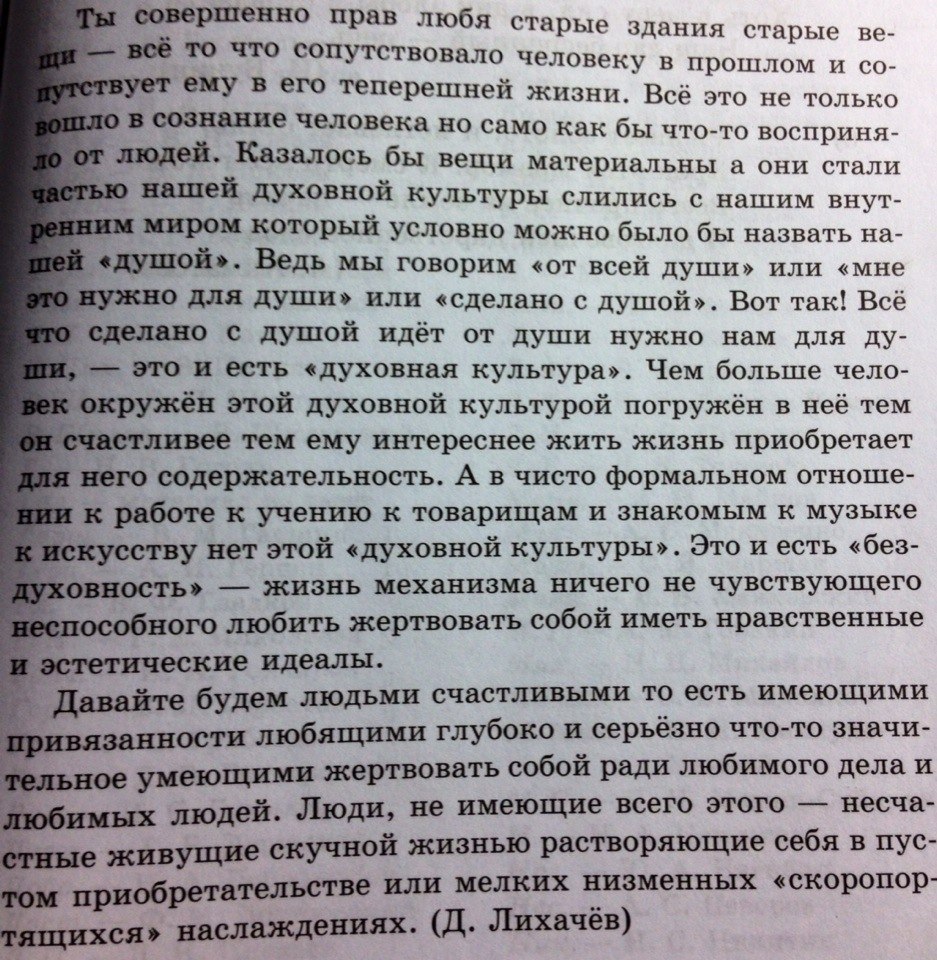 В данном тексте мы видим какой рисуется человеческая душа,здесь автор раскрывает все те частички присущие человеку,по истине каждый выбирает свое мировоззрение на мир."Духовная культура"-как выражается автор, есть человечность присущия каждому из нас и что бы она не угасала давайте не будем забывать о нравственных принцыпах.