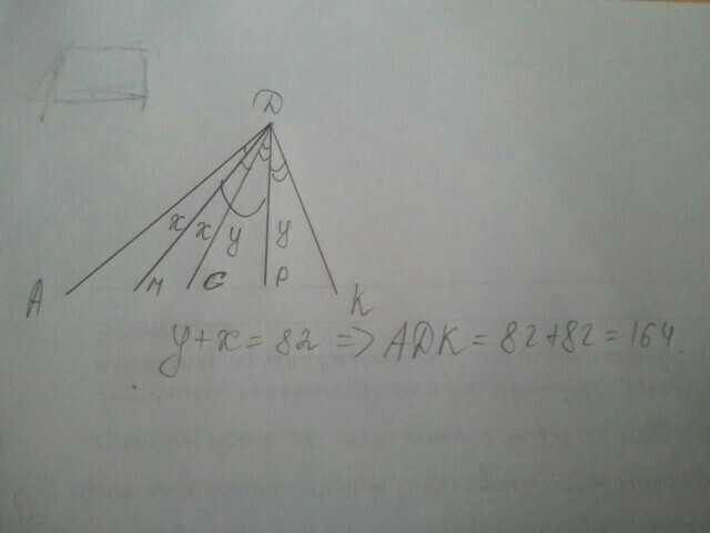 Луч DC проходит между сторонами угла ADK.Луч DM -биссектриса угла ADC ,луч DP -биссектриса угла CDK.Найдите угол ADK ,если уголMDP = 82