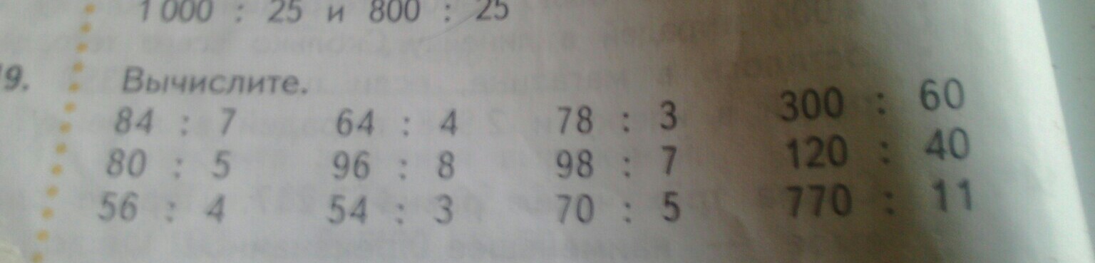 Помогите пж даю 13 баллов!!! Вычислите. 84:7 80:5 56:4 64:4 96:8 54:3 78:3 98:7 70:5 300:60 120:40 770:11 Это нужно столбиком, подбором или устно решать? Помогите плиз, я не знаю хочу понять как делить и ещё узнать ответы)