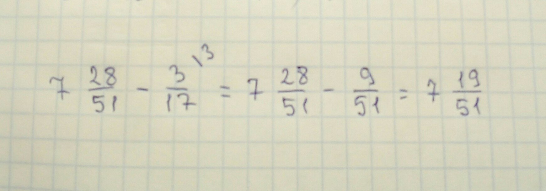 7 28/51 - 3/17=7 28/51-9/51=7 19/51