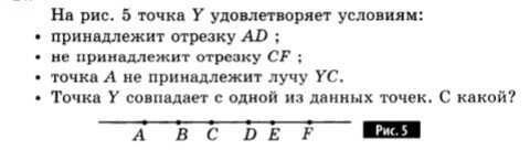 итак, здесь написано что точка у на отрезке аф значит за пределы она не вышла. не принадлежит отрезку сф значит она на отрезке ас. точка а не принадлежит лучу уц, значит это б.