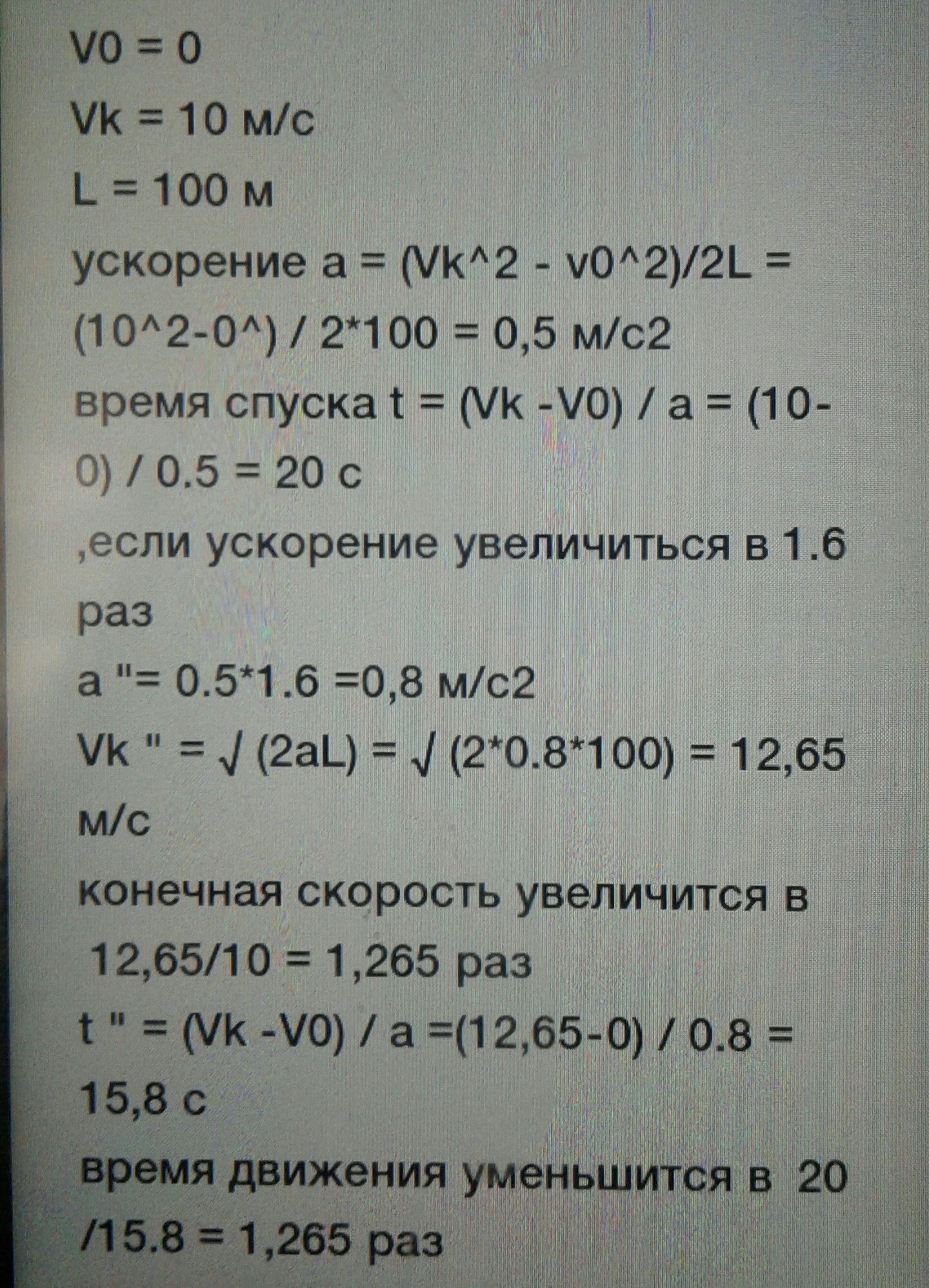 1. Лыжник спускается с горы без начальной скорости и, двигаясь равноускоренно с ускорением 0,7 м/с^2, к концу спуска имеет скорость V. Длину склона L лыжник преодолевает за 30 сек. Во сколько раз изменится время движения лыжника по склону и его конечная скорость, если ускорение увеличится в 1,8 раз?