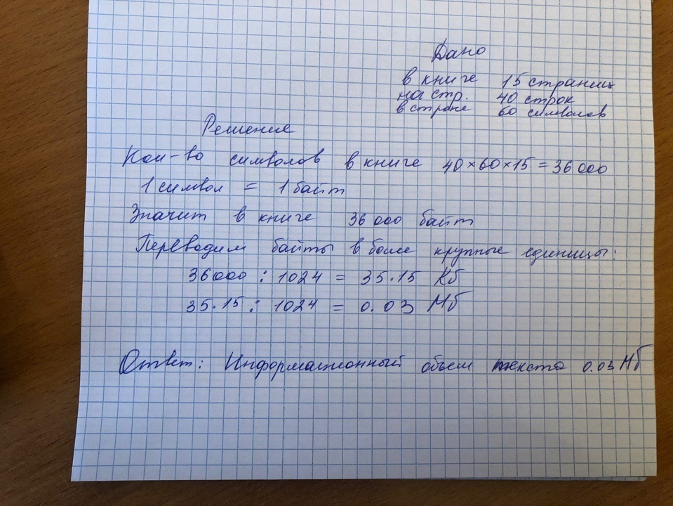 Пусть небольшая книжка, сделанная с помощью компьютера, содержит 15 страниц; на каждой странице — 40 строк, в каждой строке — 60 символов. Сколько информации она содержит?