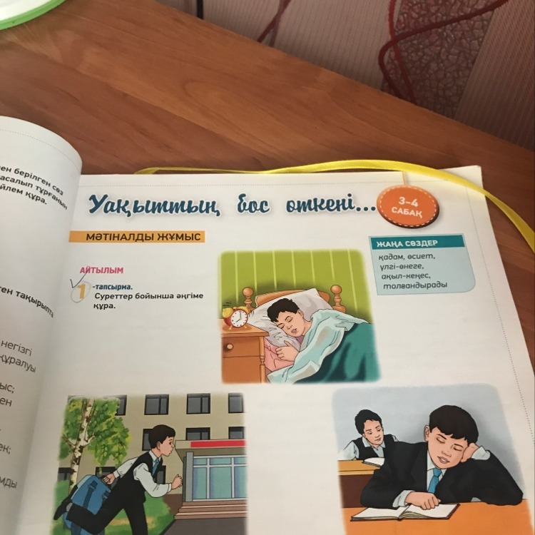 Мен күнде сағат 7 оянамын. Оянған соң мен төсегімді жинаймын, тісімді жуамын жəне таңғы асымды ішемін. Тамақтанып болғаннан соң мен киінемін жəне мектепке барамын. Мектепте мен белсенді оқушымын.