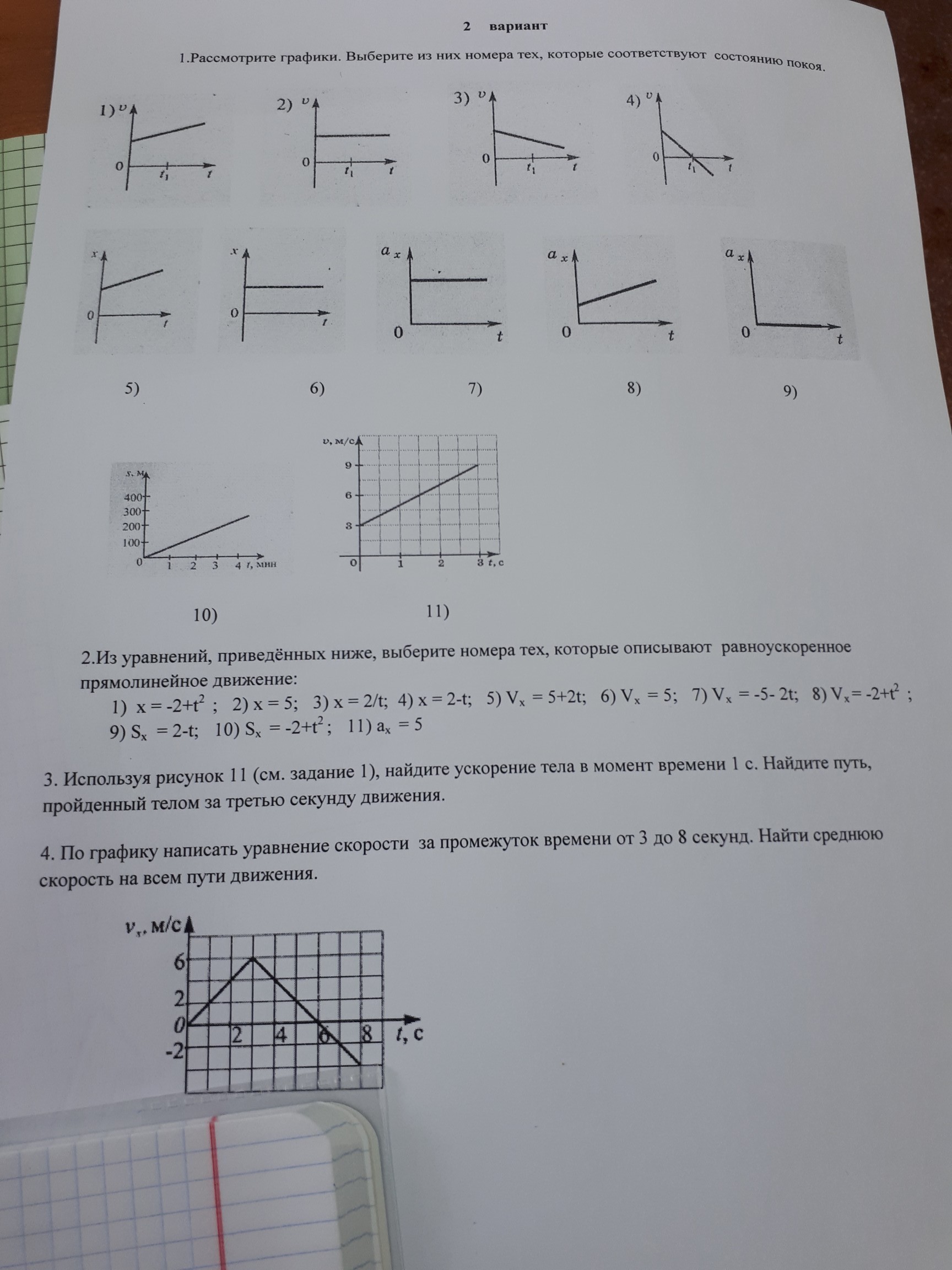 2.Равноускоренное прямолинейное движение должно соответствовать уравнению Х=Хо+Vоt+0,5аt² или V=Vo+at (V=-Vo-at):1,10,11,5,7, в 11 а= постоянному числу, т.е. равноускоренное