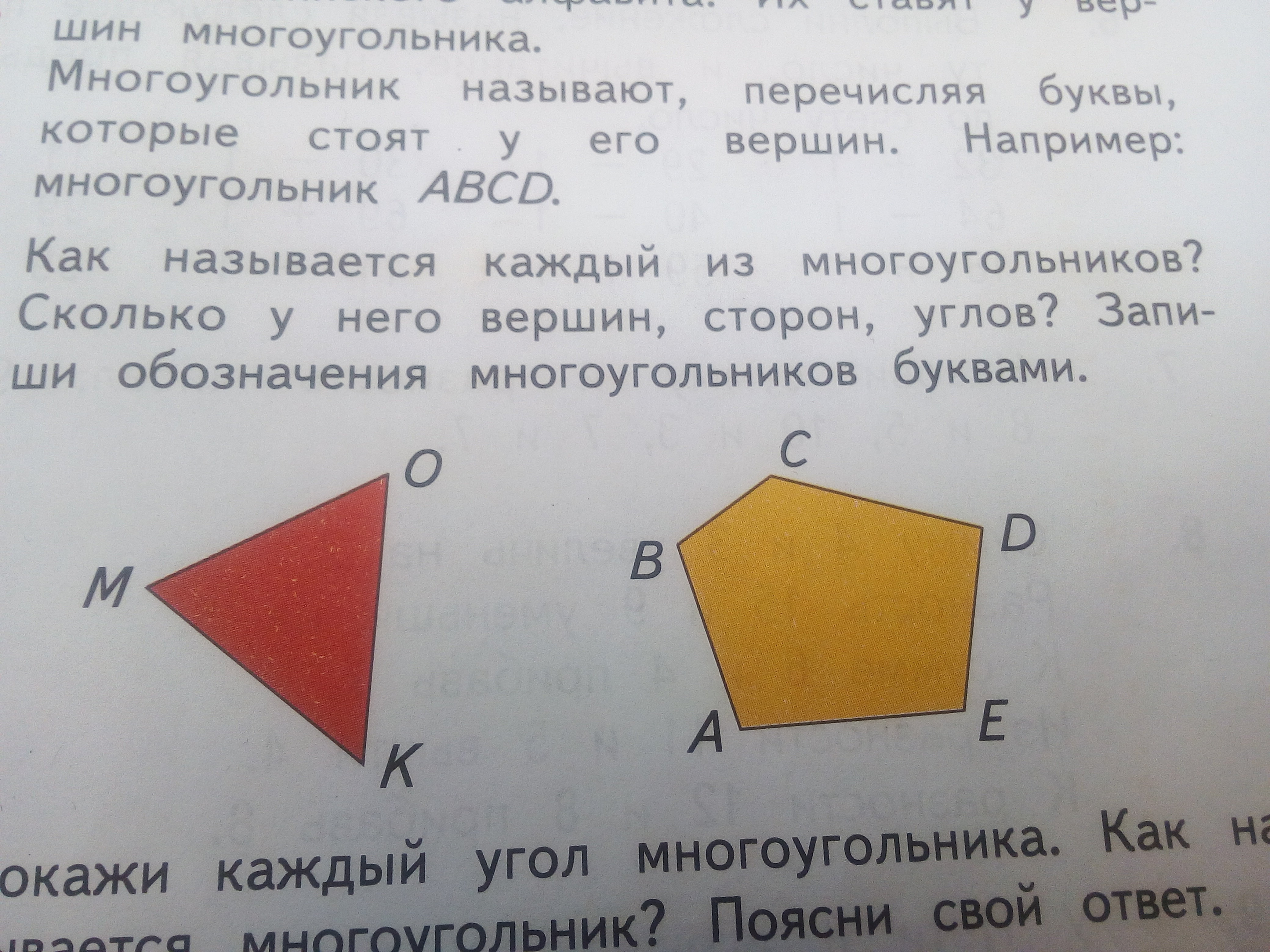 Как называется каждый из многоугольников?сколько у него вершин,сторон,углов?запиши обозначения многоугольников буквами.