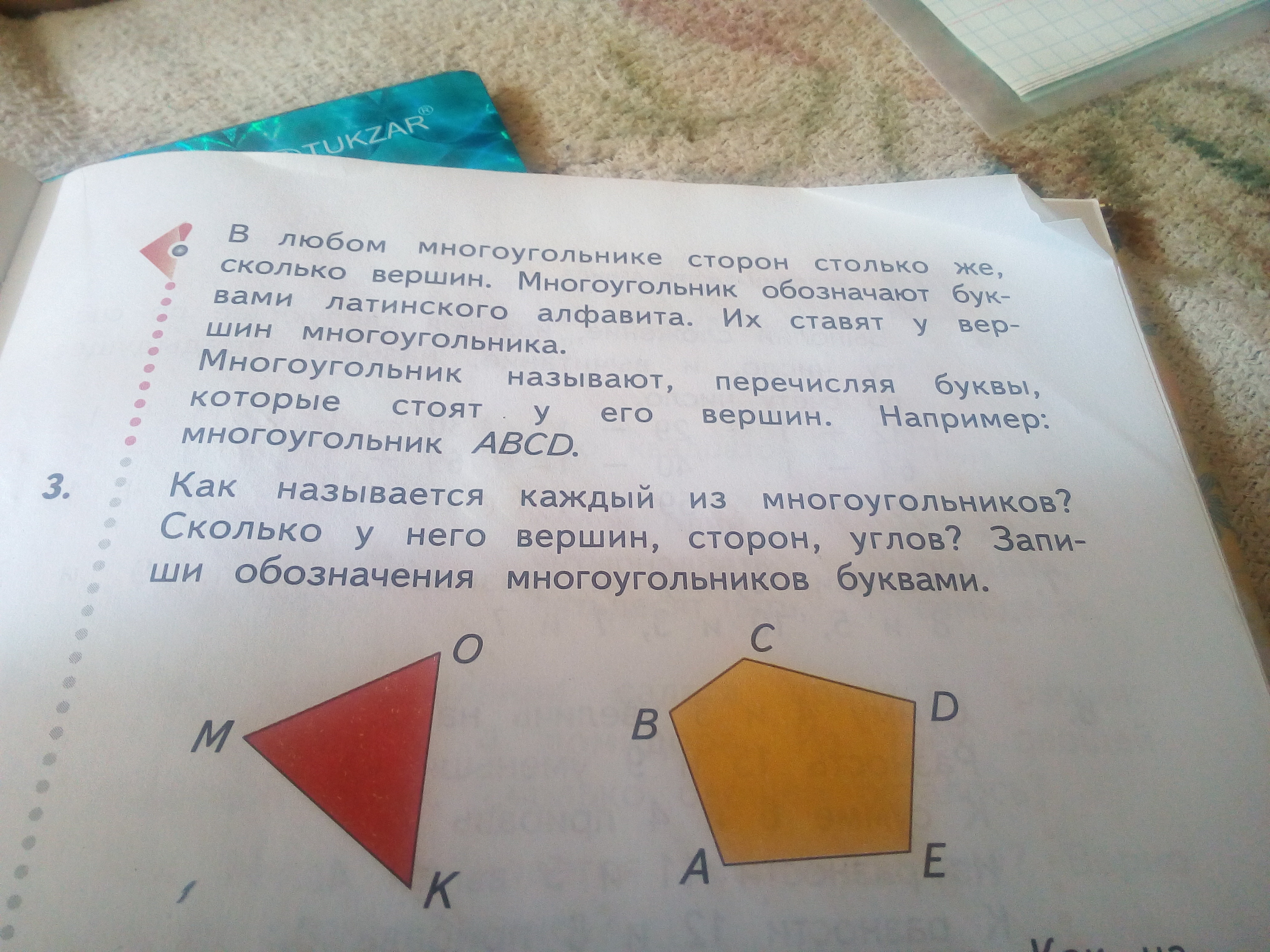2)Пятиугольник ABCDE-5 вершин, 5 сторон, 5 углов.