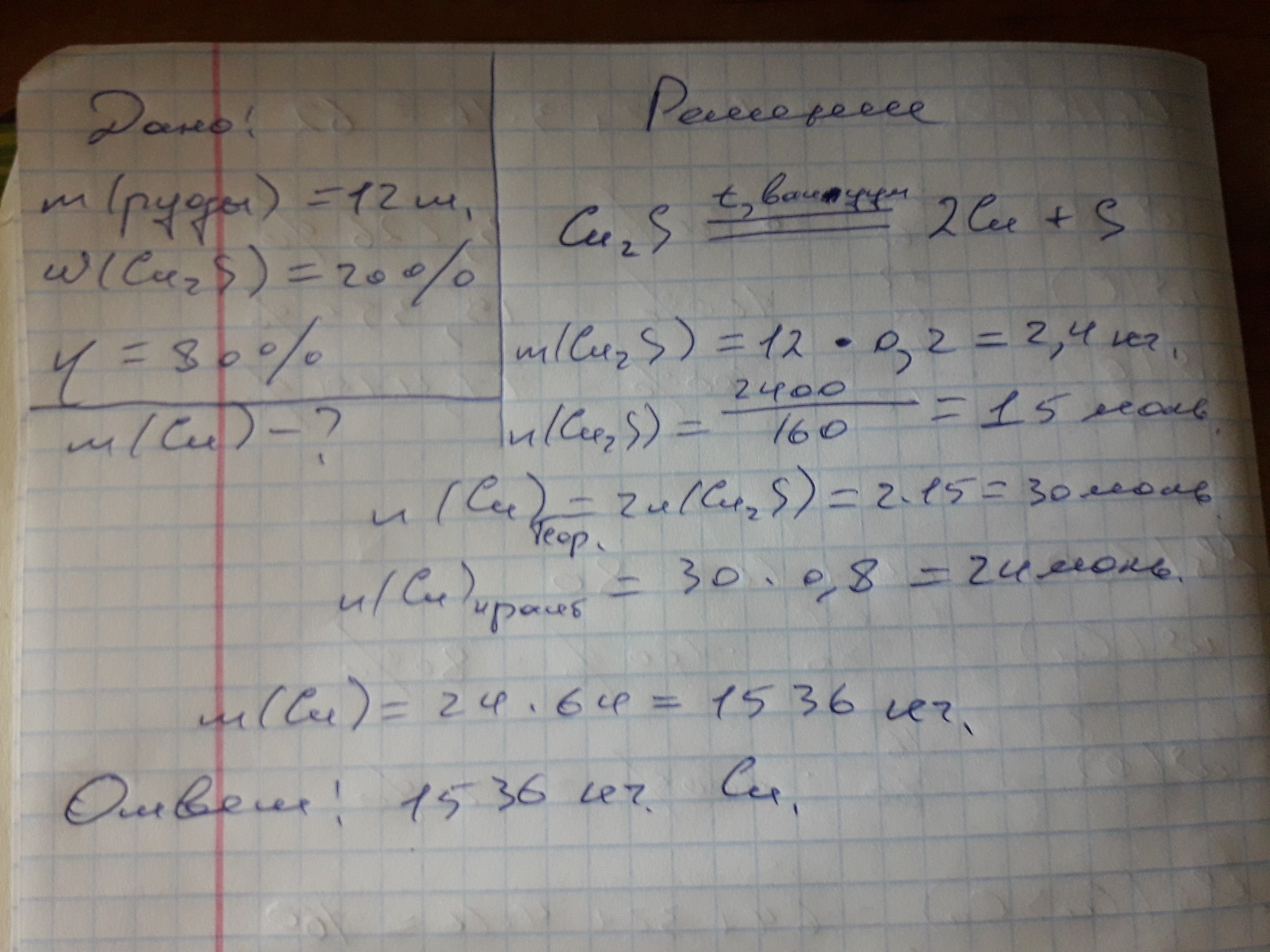 сколько килограмм меди можно получить из 12 Т обогащенной горной породы содержащей 20% сульфида меди 1.? практический выход меди составляет 80%