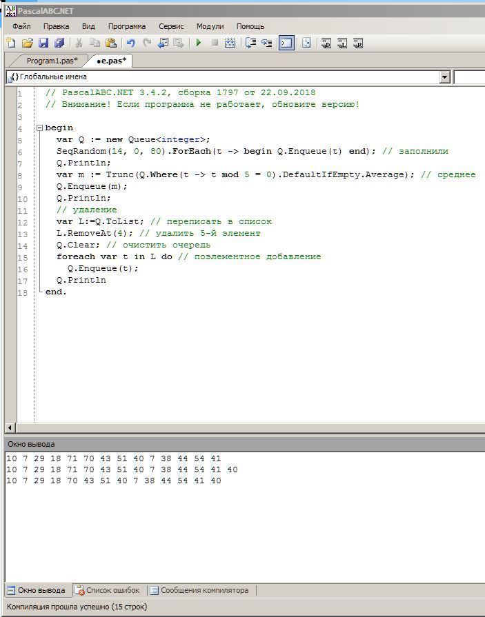Заполнить очередь 14 целыми числами из интервала [0;80]. Найти целую часть среднего арифметического кратных 5 элементов очереди. Результат поместить в очередь. Удалить 5 элемент из очереди. После выполнения каждой операции выводить содержимое очереди на экран.