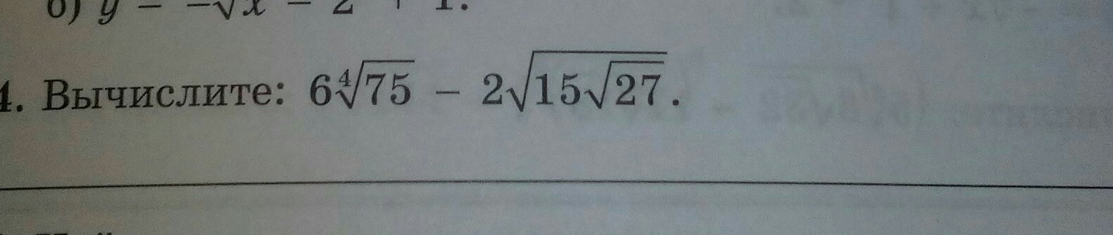 6sqrt[4]{75}-2sqrt{15sqrt{27}}=6sqrt[4]{75}-2sqrt{sqrt{15^2cdot27}}= \ =6sqrt[4]{75}-2sqrt[4]{15^2cdot27}=6sqrt[4]{75}-2sqrt[4]{3^3cdot3^2cdot5^2}= \ =6sqrt[4]{75}-2sqrt[4]{3^4cdot3cdot5^2}=6sqrt[4]{75}-2cdotsqrt[4]{3^4}cdotsqrt[4]{3cdot5^2}= \ =6sqrt[4]{75}-2cdot3sqrt[4]{75}=6sqrt[4]{75}-6sqrt[4]{75}=0