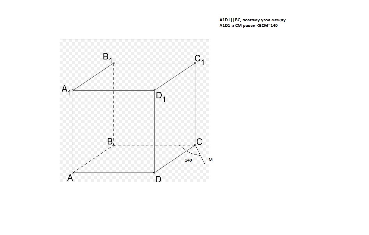Дан параллелепипед ABCDA1B1C1D1. Точка m лежит в плоскости грани ABCD. Найти угол между прямыми A1d1 и CM, если угол BCM=140°