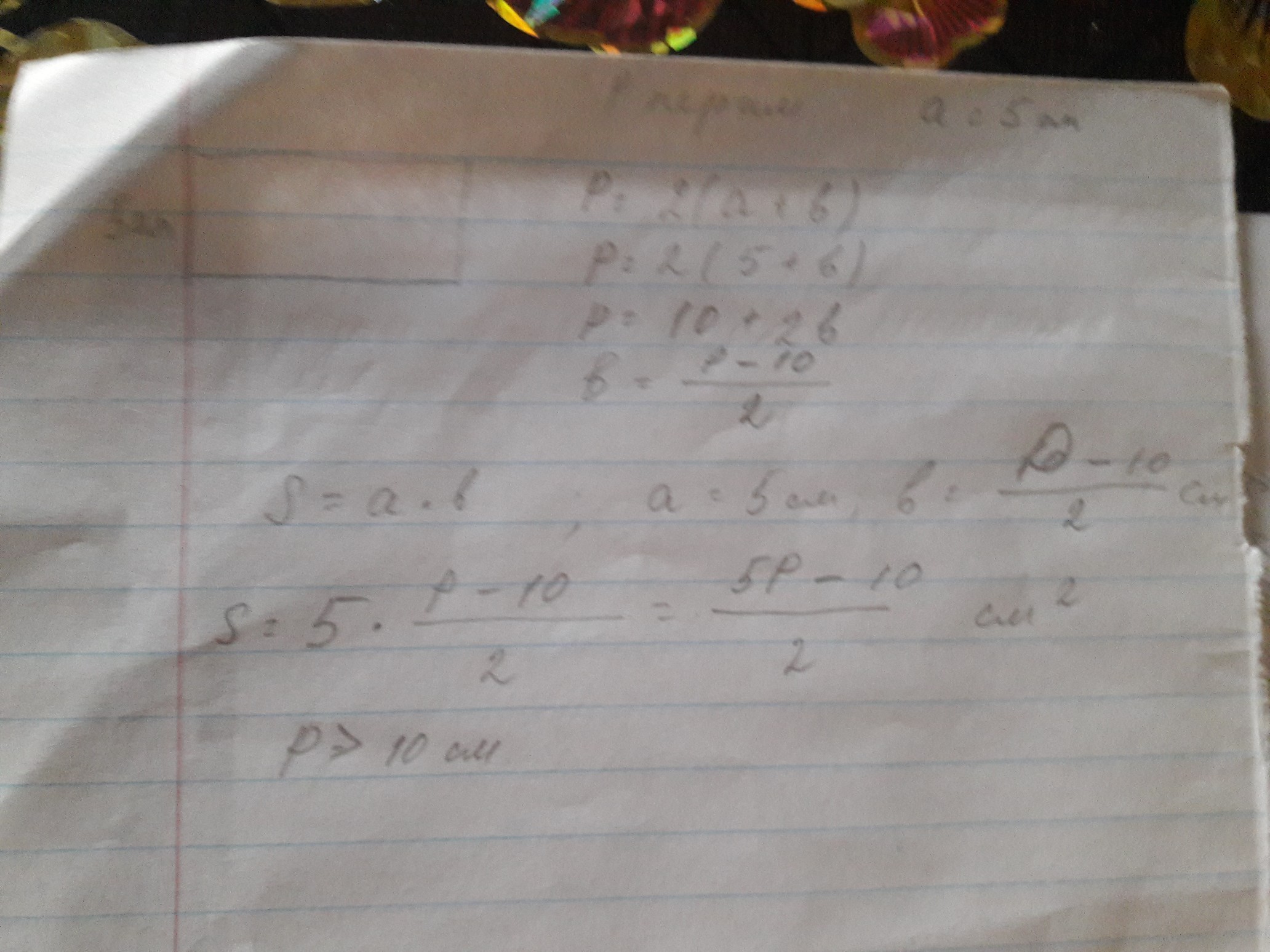 периметр прямоугольника равен Р см, высота-5 см.напишите формулу для вычисления площади прямоугольника S.какие значения может принимать Р?выразите из найденной формулы Р через S. Помогите пожалуйста.