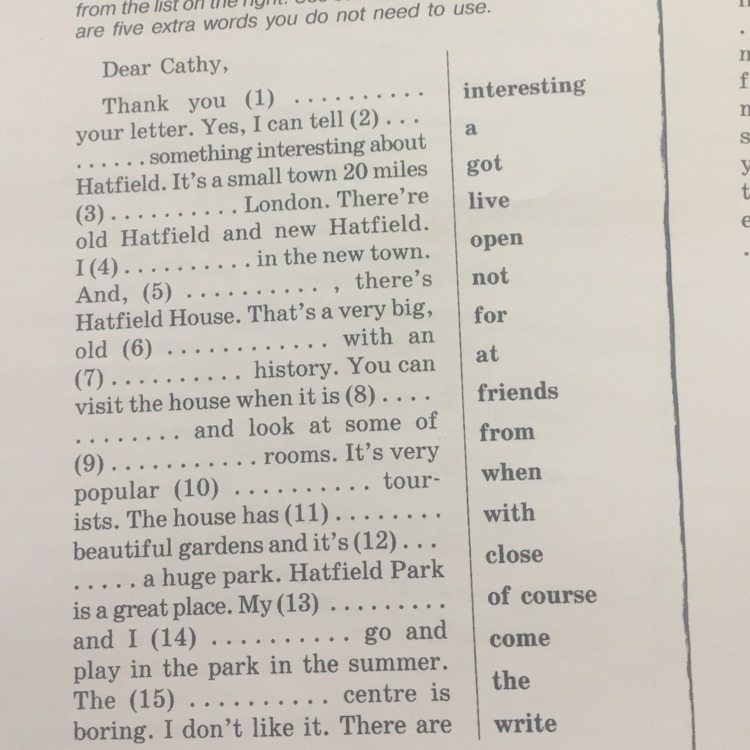 являются дополнительными словами, которые вам не нужно использовать. Дорогая Кэти Спасибо (1) .. ваше письмо. Да, я могу сказать (2) что-то интересное о Хэтфилде. Это небольшой городок, в 20 милях был старый Хатфилд и новый Хатфилд И, (5) .. нет Лондона. Там живет Хэтфилд Хаус. Это очень большой, для старых (6). , с (7) .... история. Вы можете посещать дом, когда он (8). друзьями и посмотреть некоторые из (9) номеров. Это очень популярно (10) .... тур, когда есть. В доме есть (11) .. с красивыми садами и его (12) .. это отличное место. Мой (13) ... конечно, и я (14) .. Иди и поиграй в парке летом. Центр (15) - это расточка. Мне это не нравится. Есть запись OTMeTWTb HapyueHne Kakaxa66676 25 MMHyT