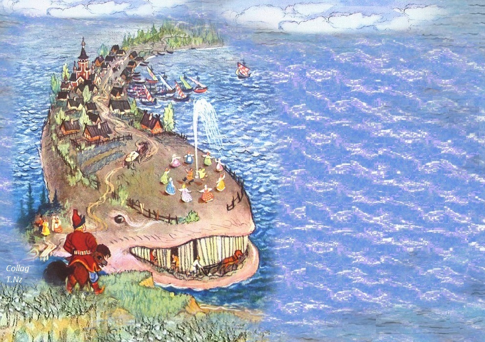 Кит по морю,по большому плыл и выпучив глаза,на спине его увидел(а) я большой,большой фонтан,не могу я нагладется на такой фонтан чудесный! На ките увидел(а) я дома чудесные!