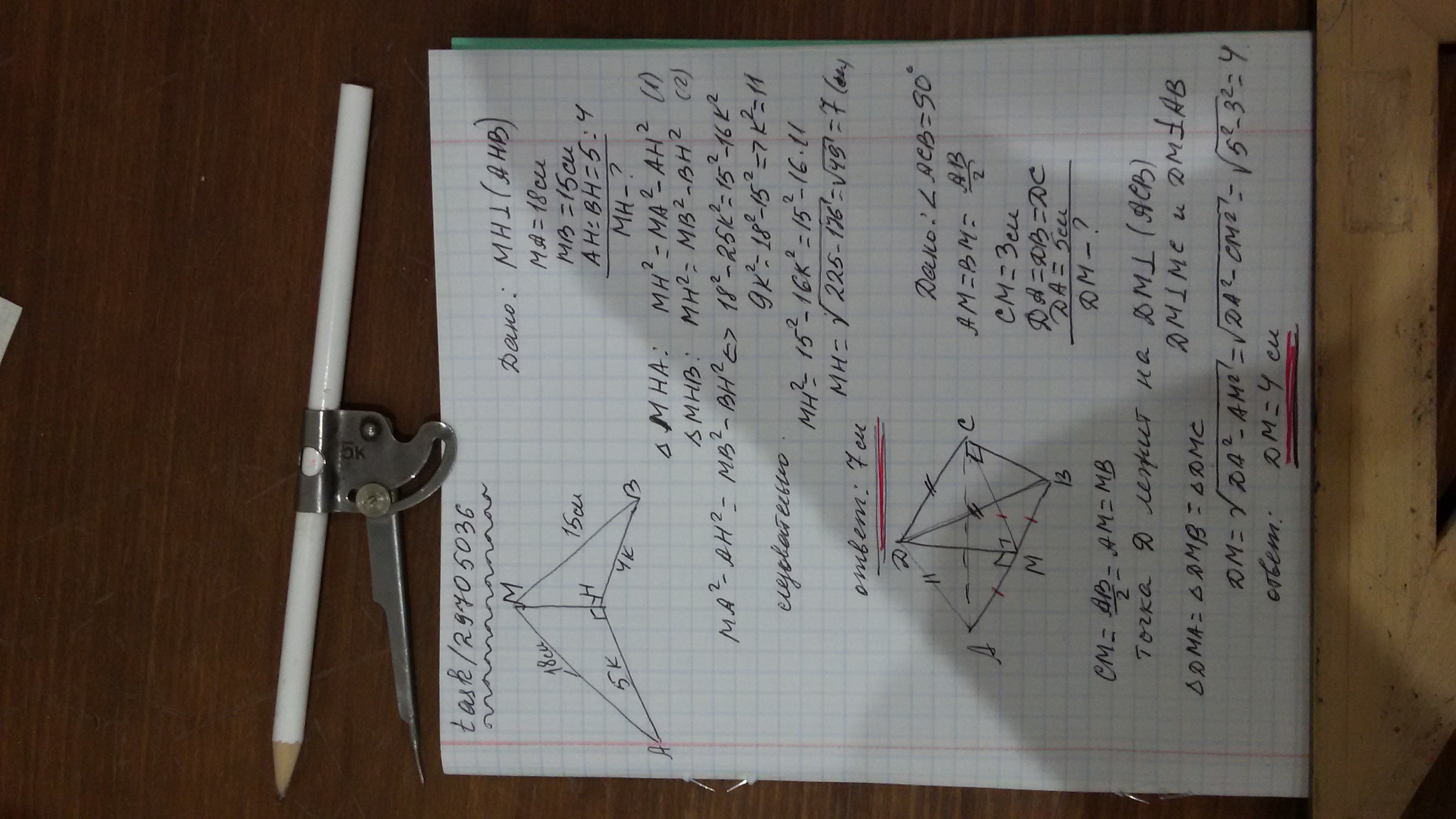 1)Отрезок MH- перпендикуляр, проведенный из точки M к плоскости ABH. Найдите MH, если MA= 18 см, MB= 15 см и AH:BH= 5:4