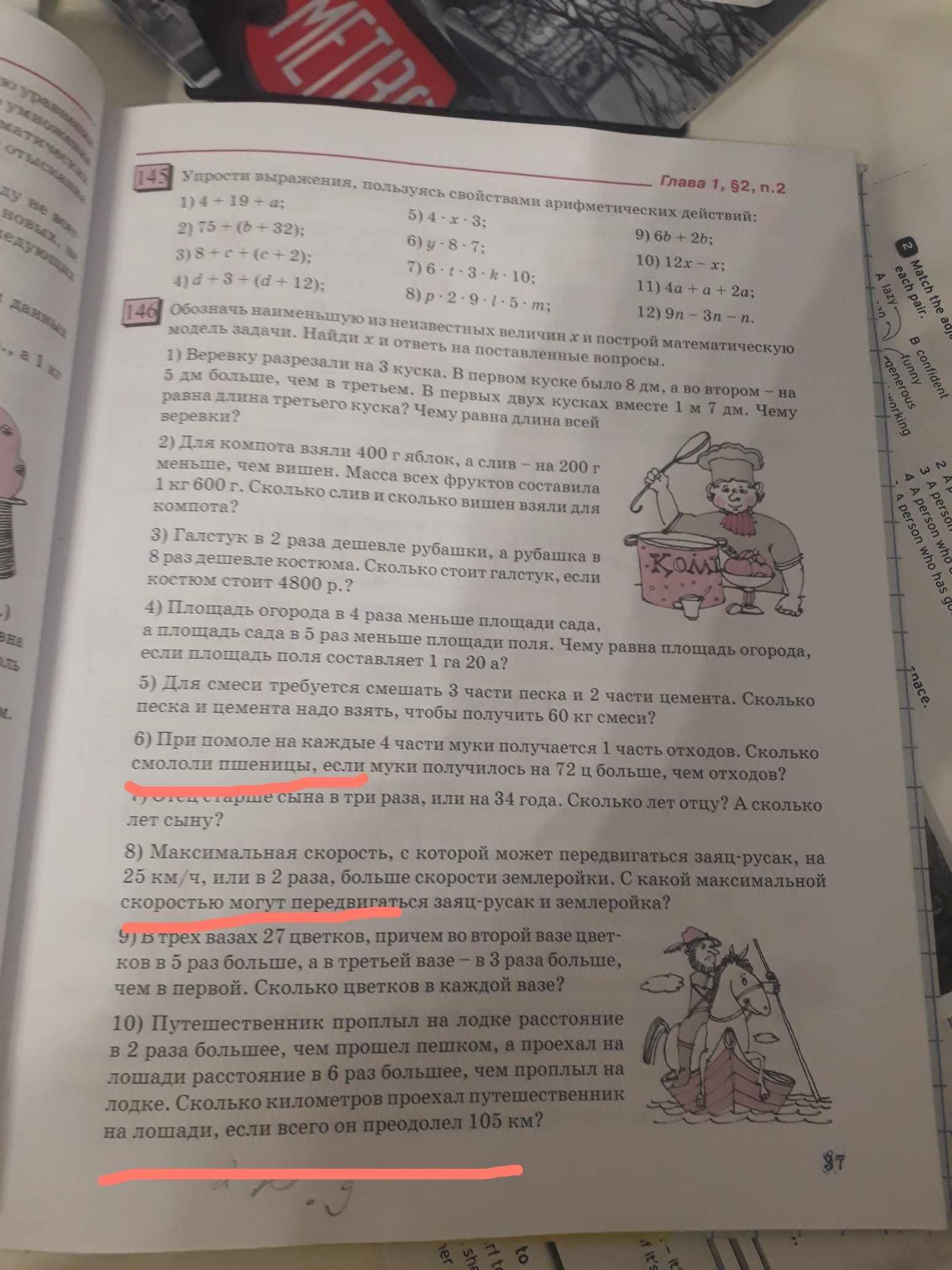10. Пусть пешком он прошёл Х км. На лодке проплыл в два раза больше, значит 2*Х. А на лошади - в 6 раз больше, чем на лодке, то есть 6*2*Х=12*Х. Весь его путь равен 105 км. Получаем и решаем уравнение: Х+2Х+12Х=105; 15Х=105; Х=105:15; Х=7. 7 км он прошёл пешком, а на лошади проехал: 12*7=84 км