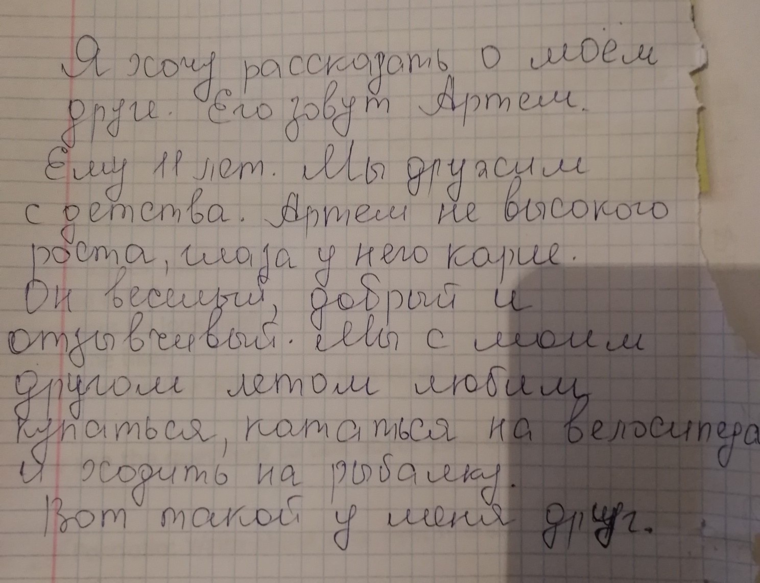 I want to tell about my friend his name is Artem he is 11 years old we are friends from childhood arya not tall eyes he has brown he is cheerful kind and sympathetic we with my friend in the summer like to swim cycling and go fishing. This is my friend's.