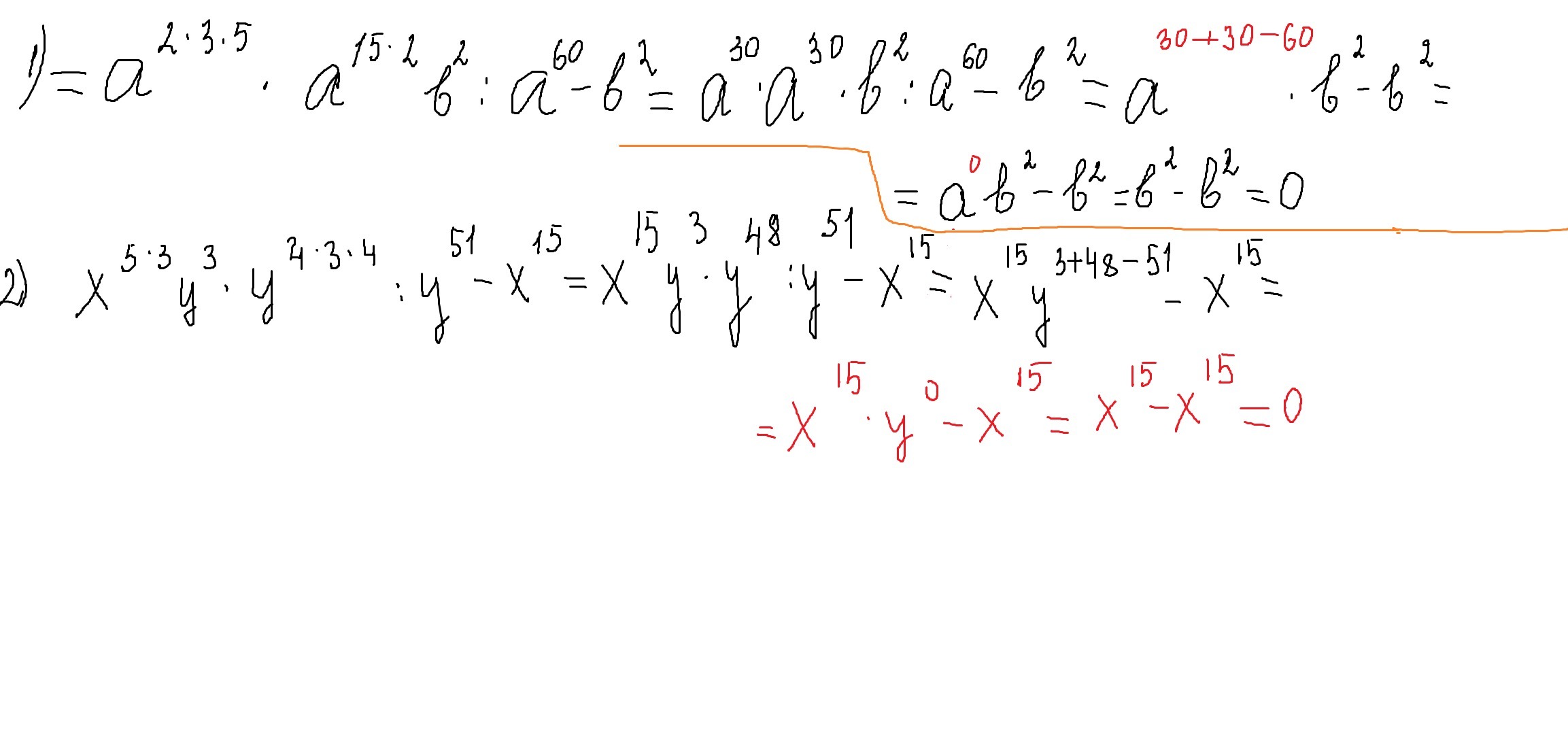 применим св-во степеней -при возведении степени в степень показатели умножаются,,при умножении-складываются,при делении-вычитаются.,любое число в нулевой степени равно 1.решение смотри внизу.
