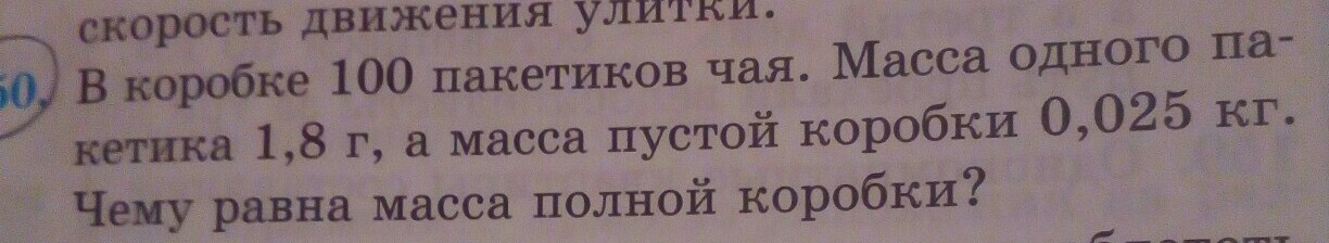 масса одного пакетика равна 1,8г, тогда масса 100 пакетиков будет 1,8*100 =180г, переведем в килограммы получается 180г=0,180кг, и даётся масса коробки, нужно найти массу 100 пакетиков и коробки, для этого 0,18кг+0,025кг=0,205кг, или 205 граммов