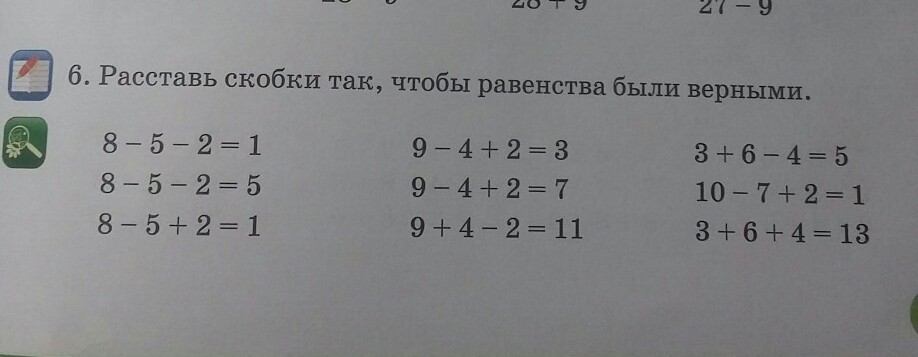 (8 -5)-2=1 8-(5-2)=5 8-(5+2)=1. 9-(4+2)=3. (9-4)+2=7. 9+(4+2)=11 (3+6)-4=5. 10-(7+2)=1. 3+(6+4)=13