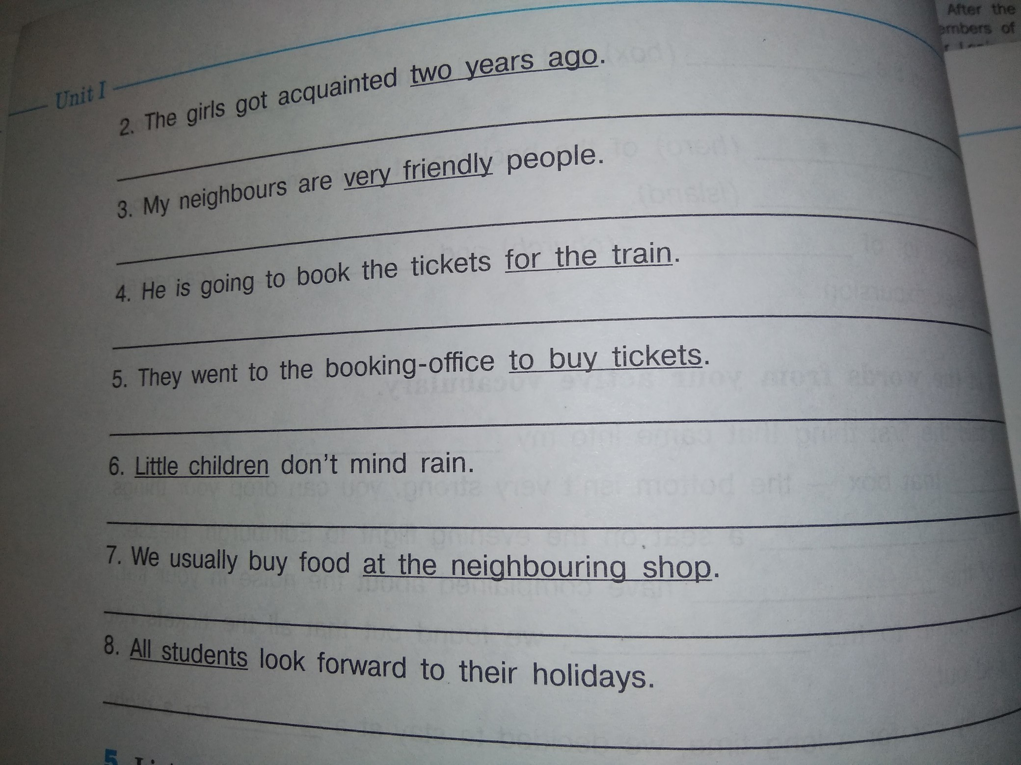 When did the girls get acquainted? What kind of people are your neighbours? What tickets is he going to book? What for did they go to the booking-office? Who don't mind rain? Where do you usually buy food? Who look forward to their holidays?