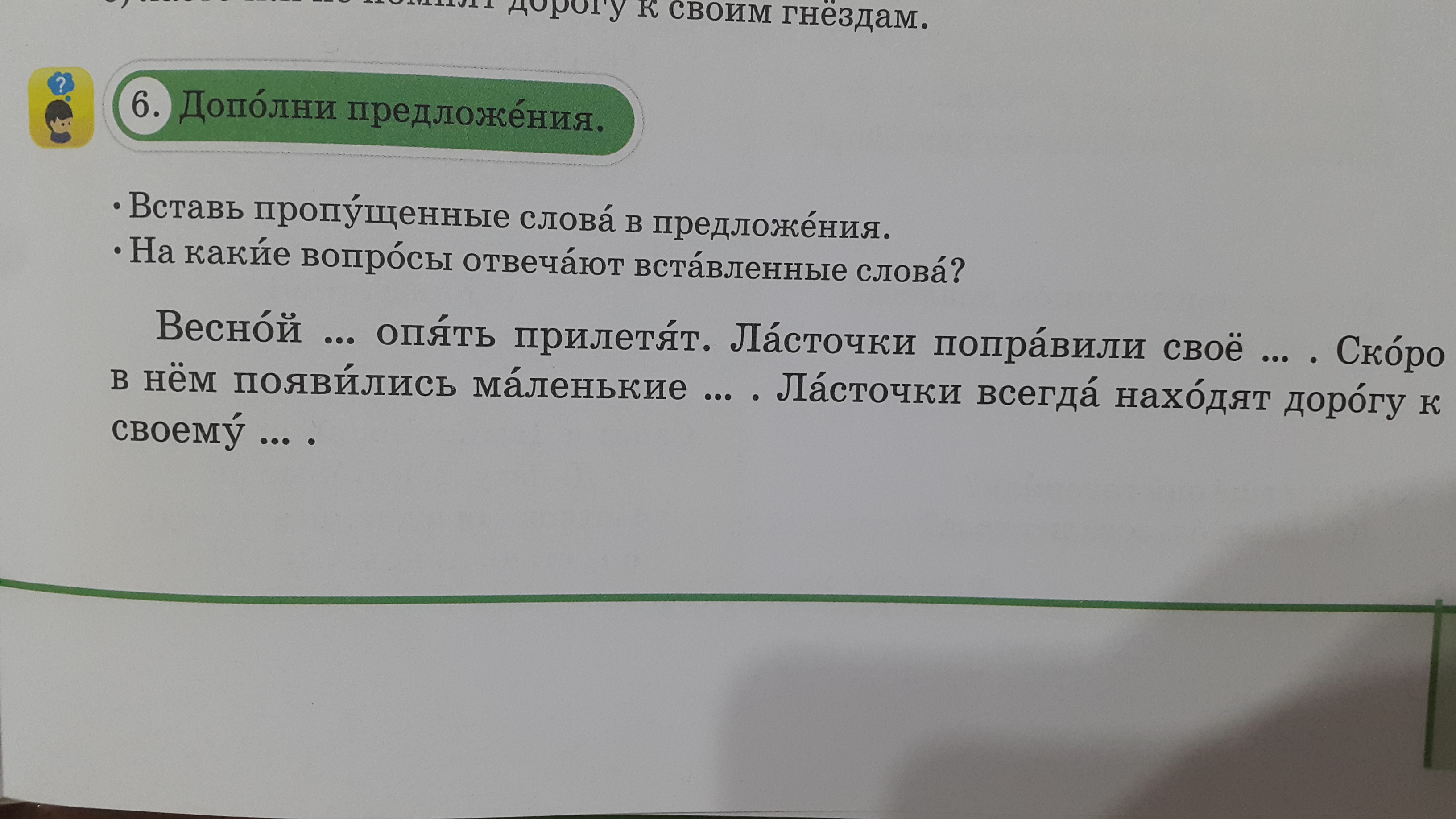 Весной птицы опять прилетят. Ласточки поправили свое гнездо. Скоро в нем появились маленькие птенцы . Ласточки всегда находят дорогу к своему дому.