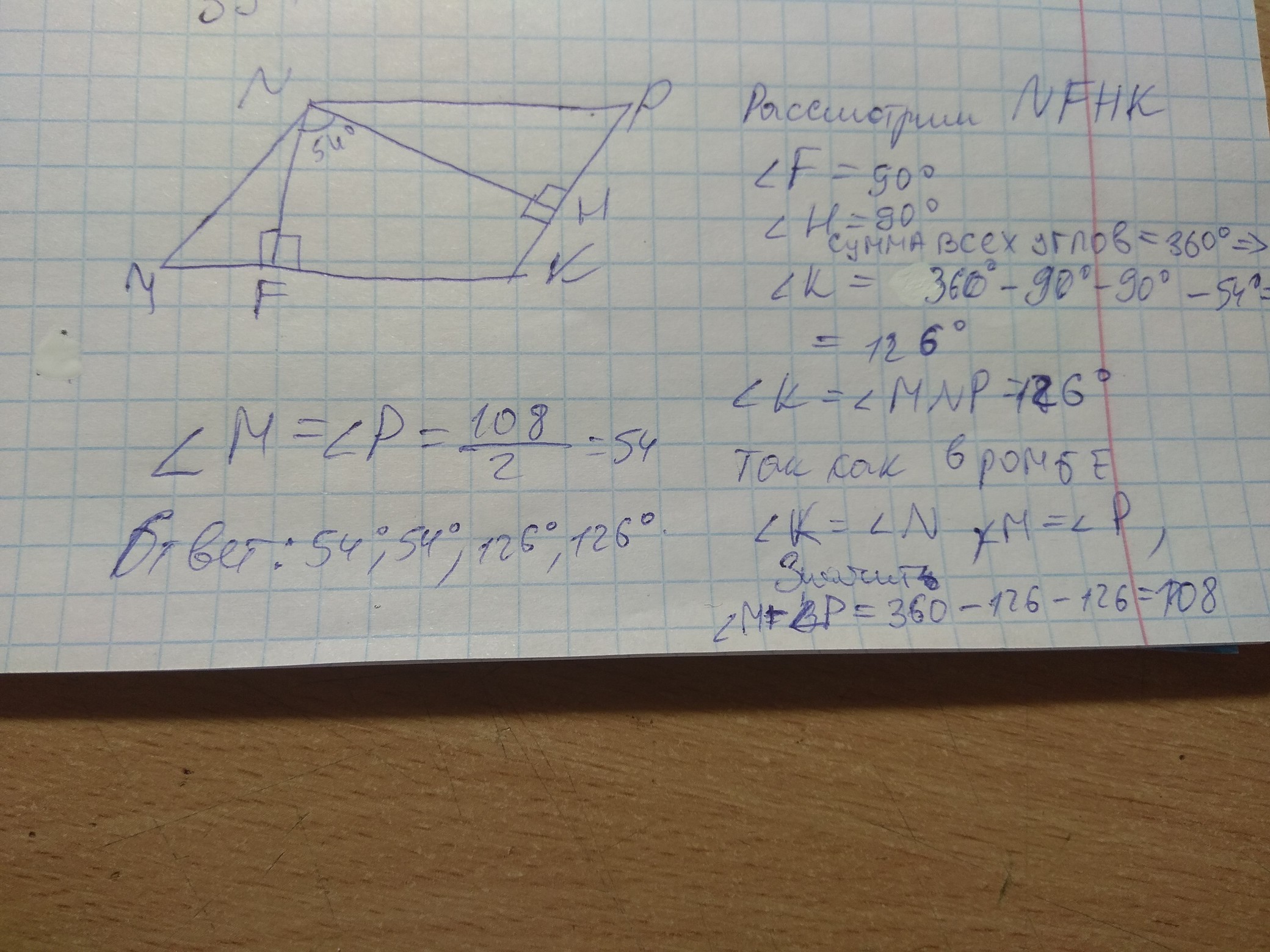 Вромбе MNPK проведены перпендикуляры NF и NH к сторонам МК и КР соответственно.Найдите углы ромба ,если угол FNH=54°.