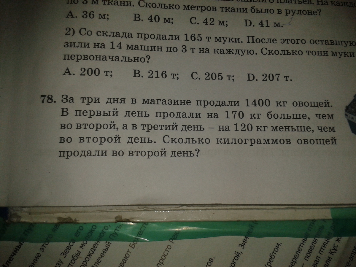 Пусть во второй день продали x кг, тогда в 1 день продали (x+170)кг, а в 3 день продали (x-120) кг. Всего продали 1400 кг. Составим и решим уравнение: x+(x+170)+(x-120)=1400