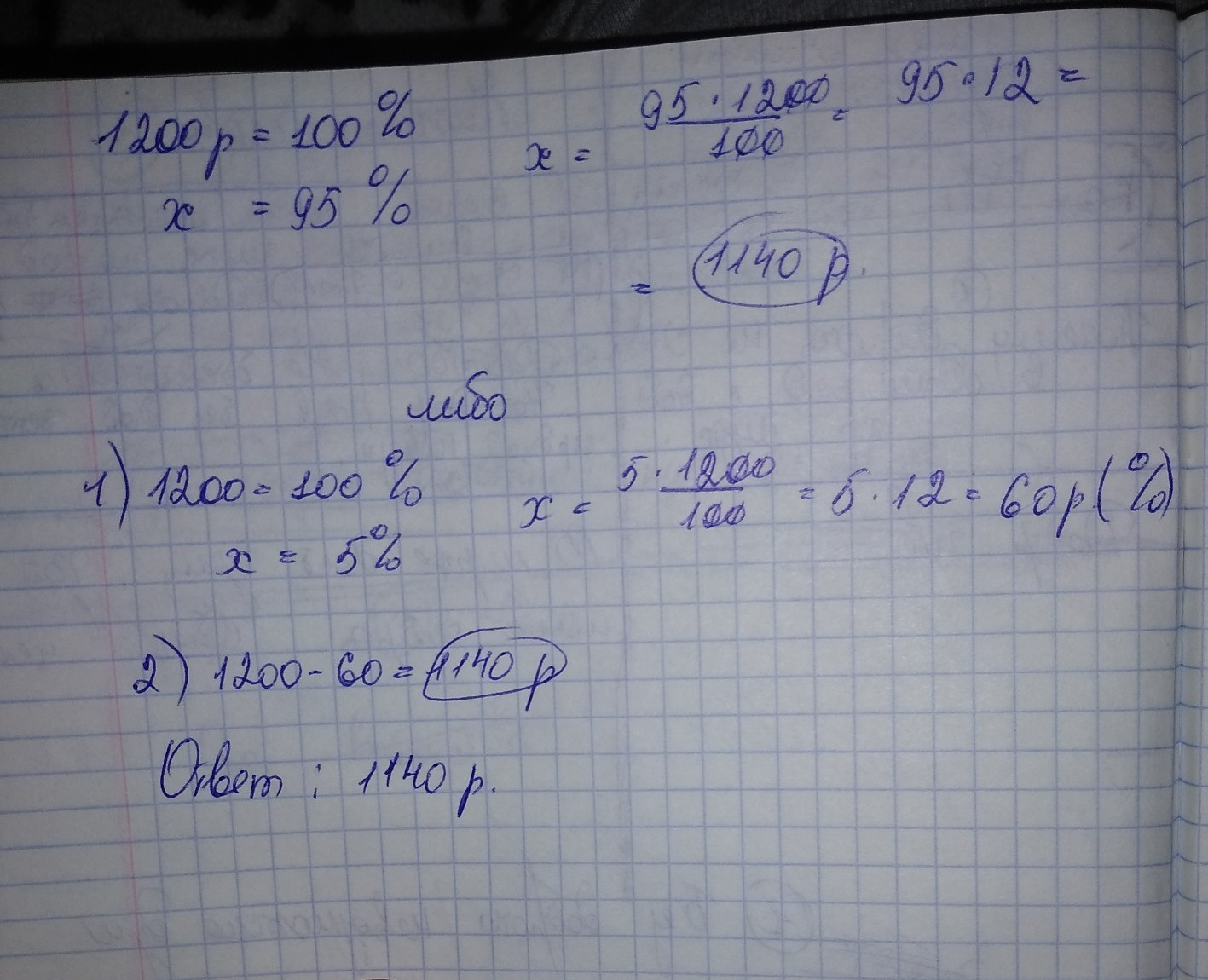 Эта задача решается с помощью пропорции двумя способами. Либо мы от ста % отнимаем сколько % у нас скидка. Либо мы сначала узнаем сколько р скидка и отнимаем ее от общей стоимости. На фотографии эта задача решена двумя способами. В общем просто спиши что я написала и усё) Сорян один ноль забыла
