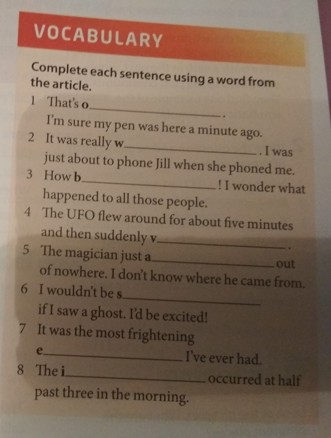1 odd 2 weird 3 bizarre 4 vanished 5 appeared 6 scared 7 experiment/experience/event 8 inspector