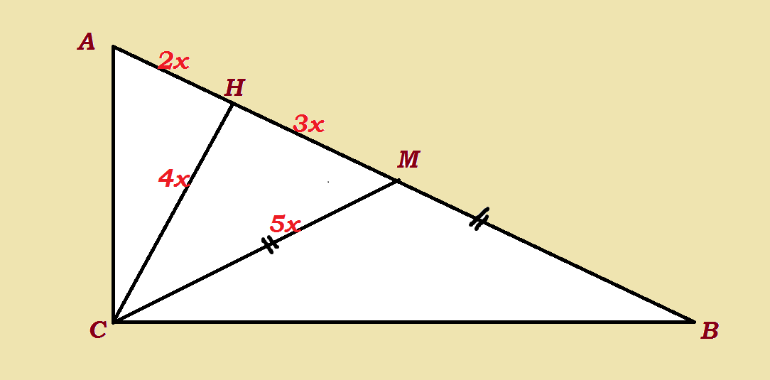 АМ = МВ = СМ = 5х (в прямоугольном треугольнике медиана, проведенная к гипотенузе равна двум отрезкам на которые она делит гипотенузу)