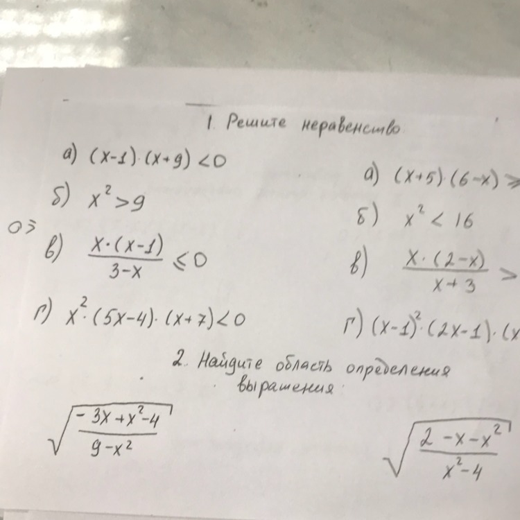 1); ; (x-1)(x+9)<0qquad +++(-9)---(1)+++\\xin (-9,1)\\2); ; x^2>9; ,; ; (x-3)(x+3)>0; ,\\+++(-3)---(3)+++qquad xin (-infty ,-3)cup (3,+infty )\\3); ; frac{x(x-1)}{3-x}leq 0; ,; ; frac{x(x-1)}{-(x-3)}leq 0; ,; ; frac{x(x-1)}{x-3}geq 0\\---[, 0, ]+++[, 1, ]---(3)+++qquad xin [, 0,1, ]cup (3,+infty )\\4); ; x^2(5x-4)(x+7)<0; ,\\+++(-7)---(0)---(4/5)+++\\xin (-7,0)cup (0,frac{4}{5})