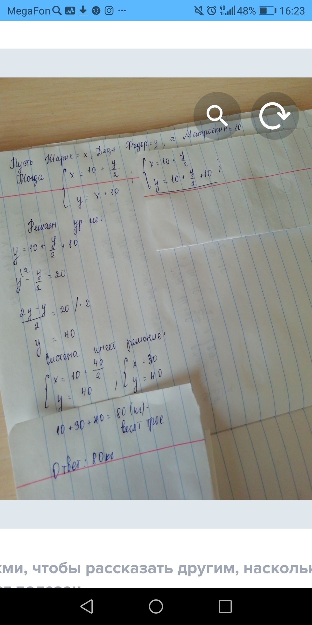 Шарик весит больше кота Матроскина на половину веса дяди Федора, дядя Федор - столько, сколько Шарик и Матроскин вместе. Матроскин весит 10кг. Сколько весят трое из Простоквашино вместе?