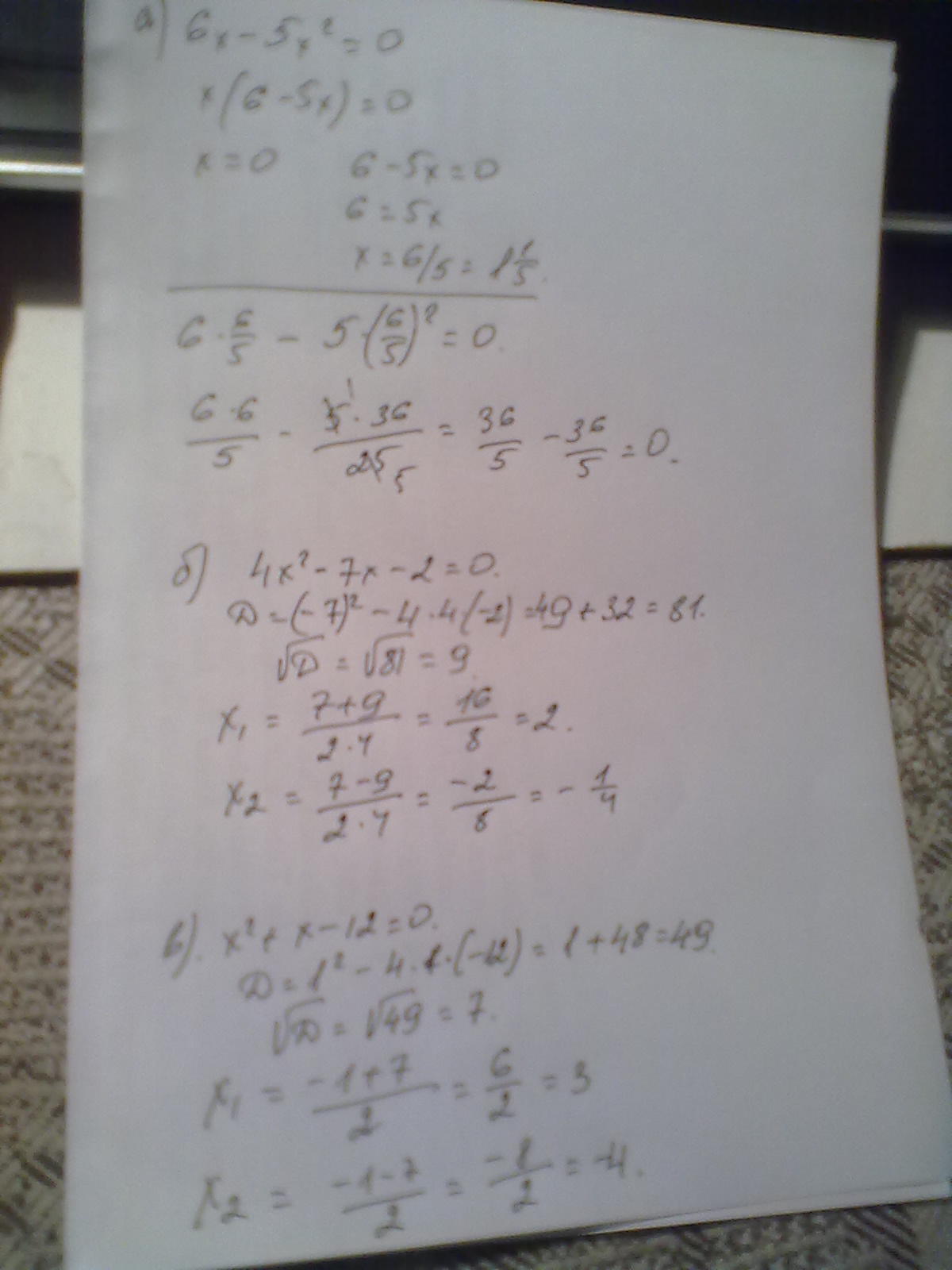 1)6x-5x2( в квадрате)=0; х(6-5х)=0; х=0 и х=1,2