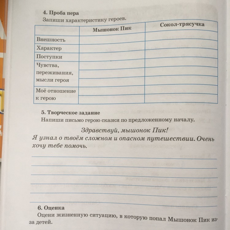 внешность мышонка - маленький , трясучка велечиной с голубя. характер- мышонок добрый ,сокол злой ,поступки у мышонка - хорошие у птицы -плохие ,чувства у мышонка - страх что его утащит птица ,у птицы е пережмвал искал добычу , мое отношение к героям ,- мышонка жалко ,трясучка-не понравилась