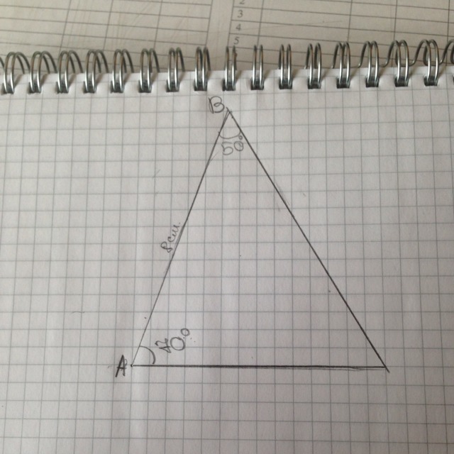 Построй треугольник ABC, если известно, что сторона AB равна 8 см, угол A равен 70°, угол B равен 50°.