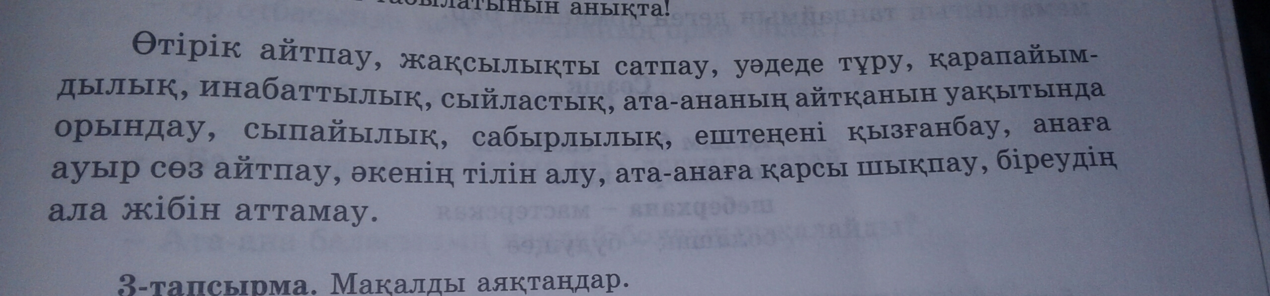 Не врать, не предавать, держать обещание, простота, воспитанность, уважение, слушаться родителей, вежливость, спокойствие, не жадничать, не говорить плохих слов маме, слушаться папу, не перечить родителям, не воровать(смысл такой)