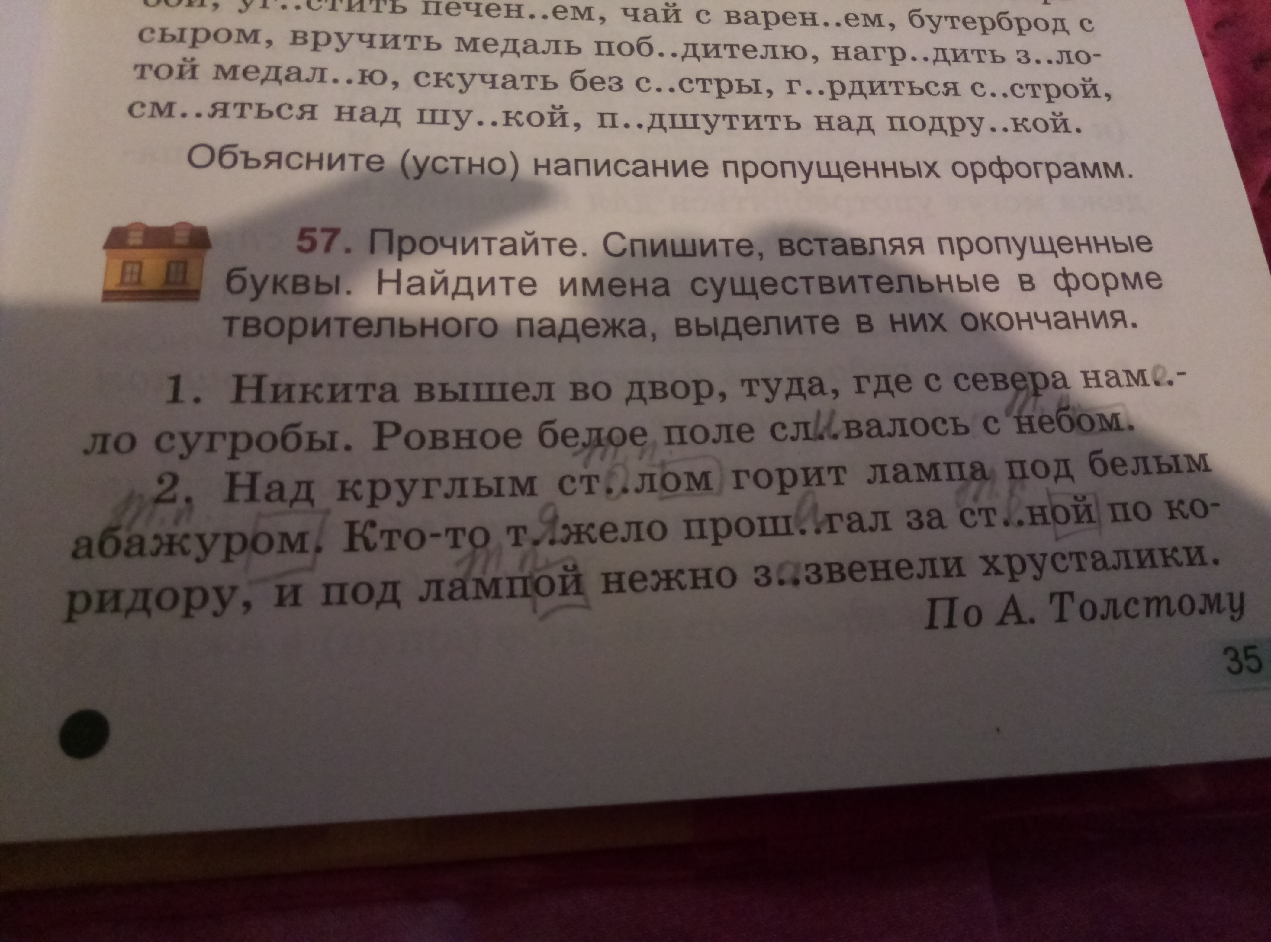 Русс.язНайдите имена сущест.в форме творительного падежа,выделите окончание.никита вышел во двор,туда,где с севера намело сугробы.ровное белое поле сливалось с небом.над круглым столом горит лампа под белым абажуром.кто-то тяжело прошагал за стеной по коридору,и под лампой нежно зазвенели хрусталики.