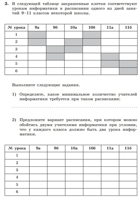 В следующей таблице закрашенные клетки соответствуют урокам информатики в расписании одного из дней занятий 9-11 классов некоторой школы.