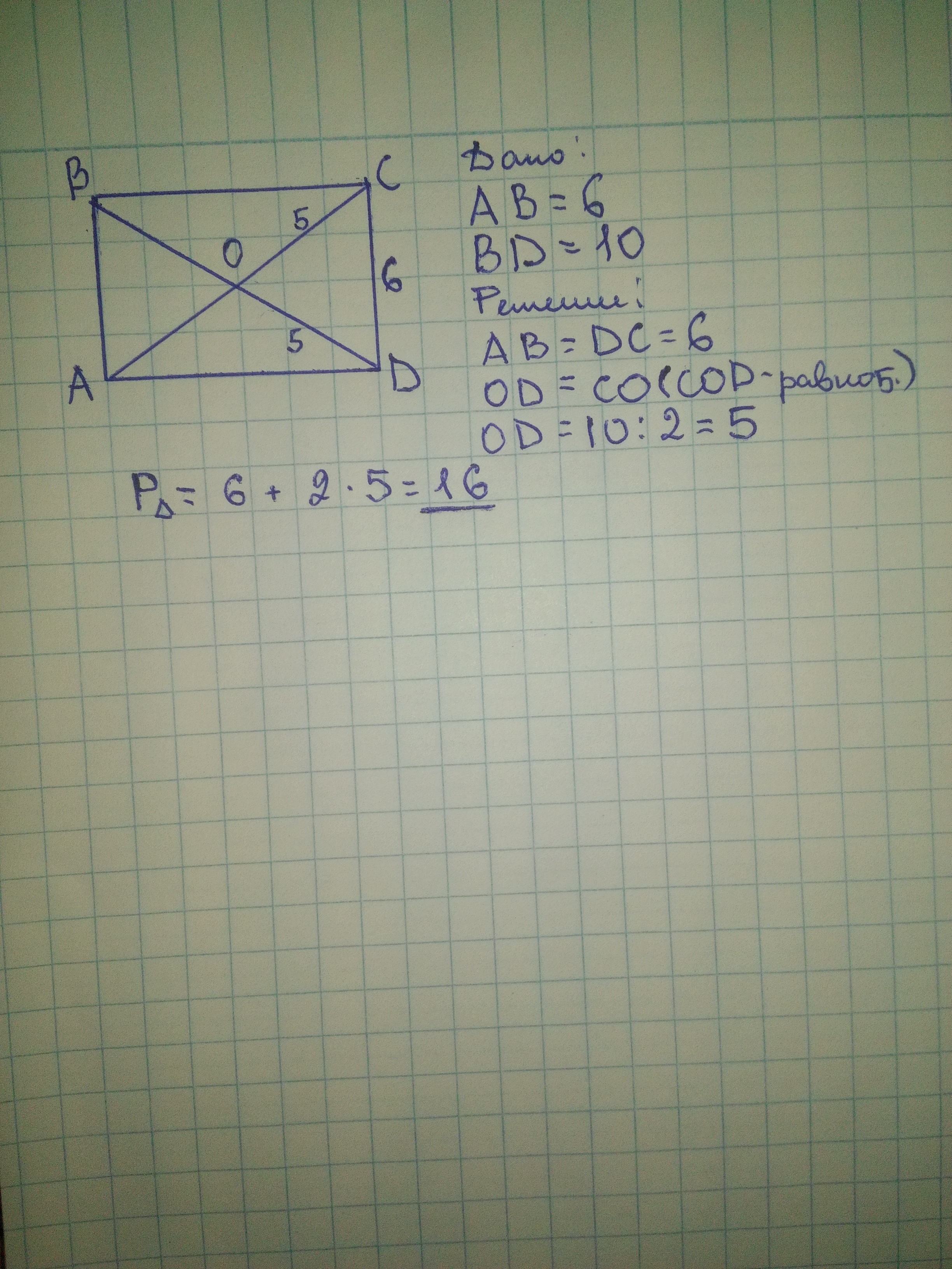 Сторона АВ прямоугольника АВСD равна 6 а его диагональравна 10 см. Найдите периметр треугольника COD