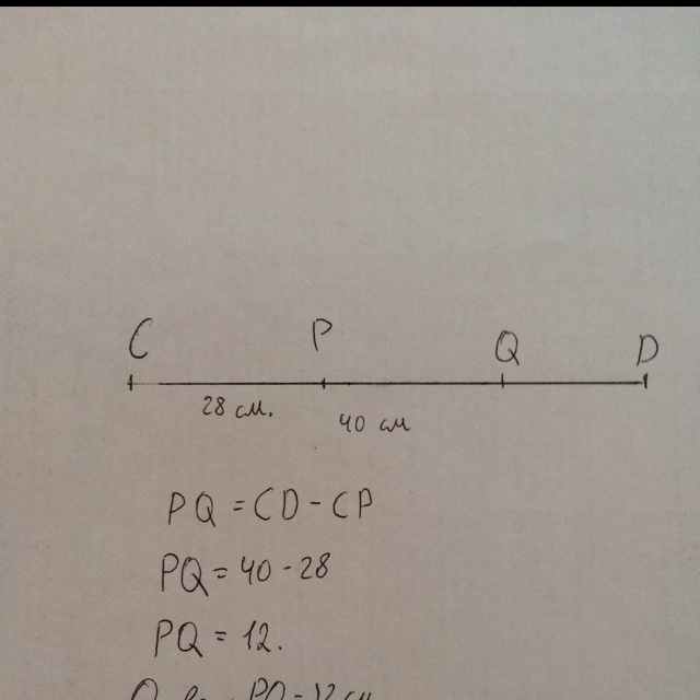 На отрезке CD длиной 40см отметели точки P и Q так, что CP=28cm.Чему равна длина отрезка PQ?С РИСУНКОМ(ЧЕРТЕЖОМ)