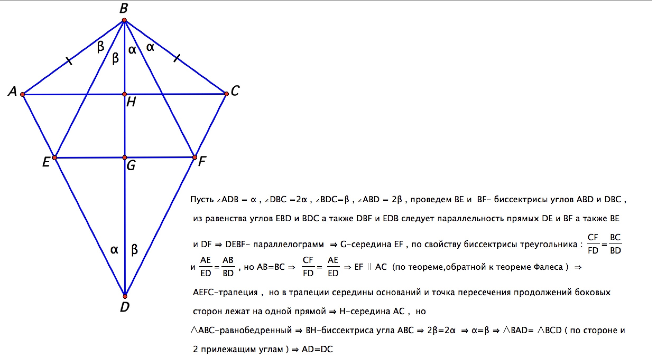 Четырехугольник ABCD – выпуклый. Известно, что AB = BC, угол СВD= 2 углам ADB и угол ABD = 2 углам BDC. Докажите, что AD = DC.